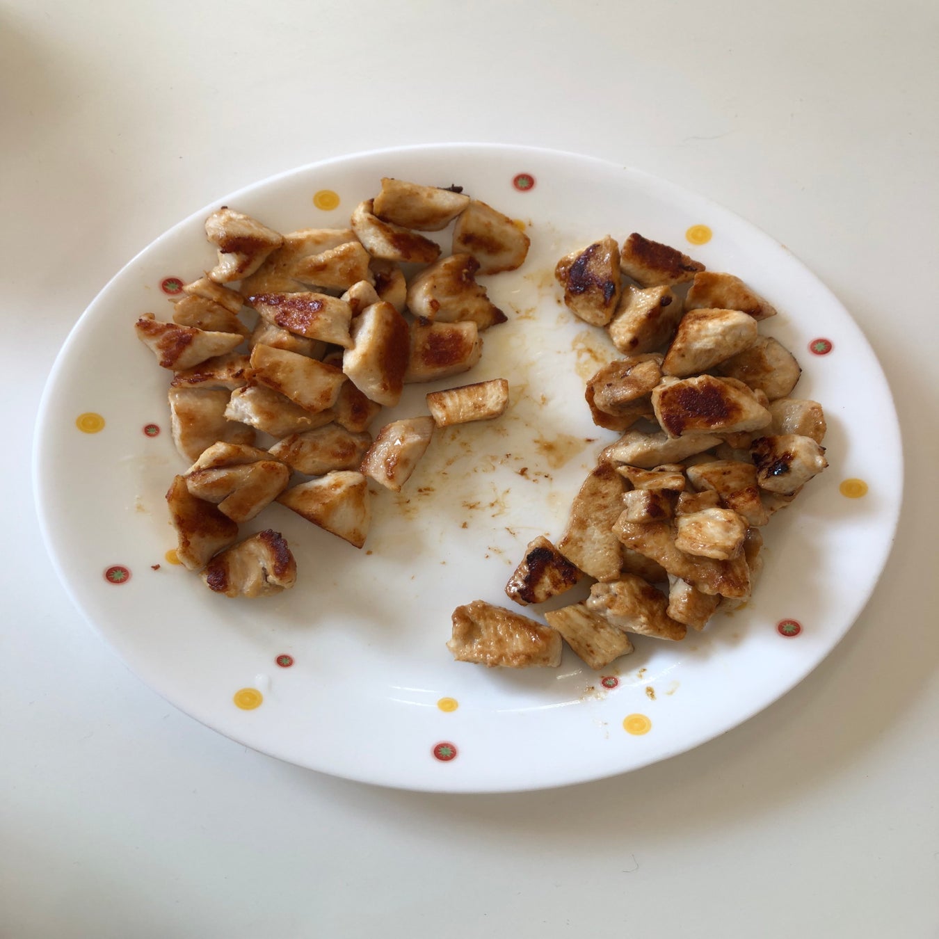 バナナの皮で鶏肉を包んでやわらかくしました。包まないチキンと食べ比べできます。