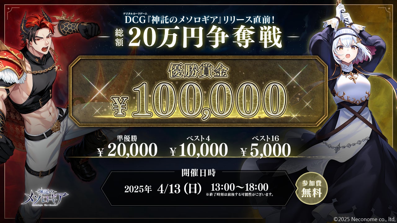 株式会社ネコノメ(本社:東京都中央区、代表取締役:工藤ショーン、以下「ネコノメ」)は、オープンβテスト(以下、OBT)実施予定の心理戦カードゲーム『神託のメソロギア』において、公式オンライン大会『神託のメソロギア』20万円争奪ダブルエリミネーショントーナメントを、2025年4月13日(日)に開催いたします。