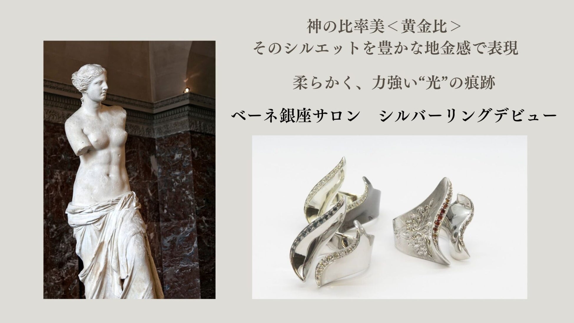 ベーネでは、この古代ギリシャ時代に創られた、ヘレニズム期の彫刻<ミロのビーナス>と、彫刻、宝石を融合させたジュエリーを【光の痕跡】テーマに制作。