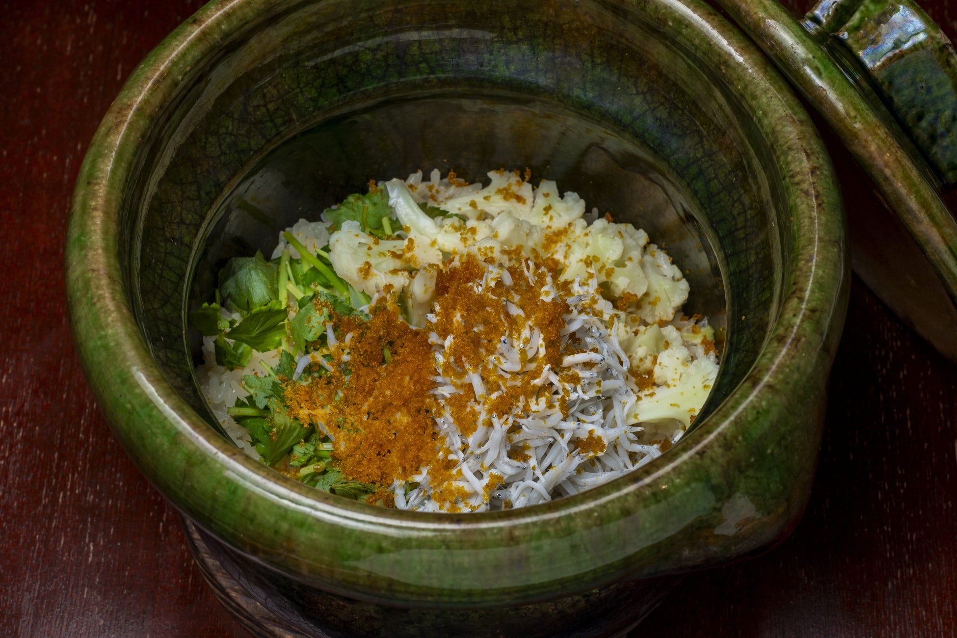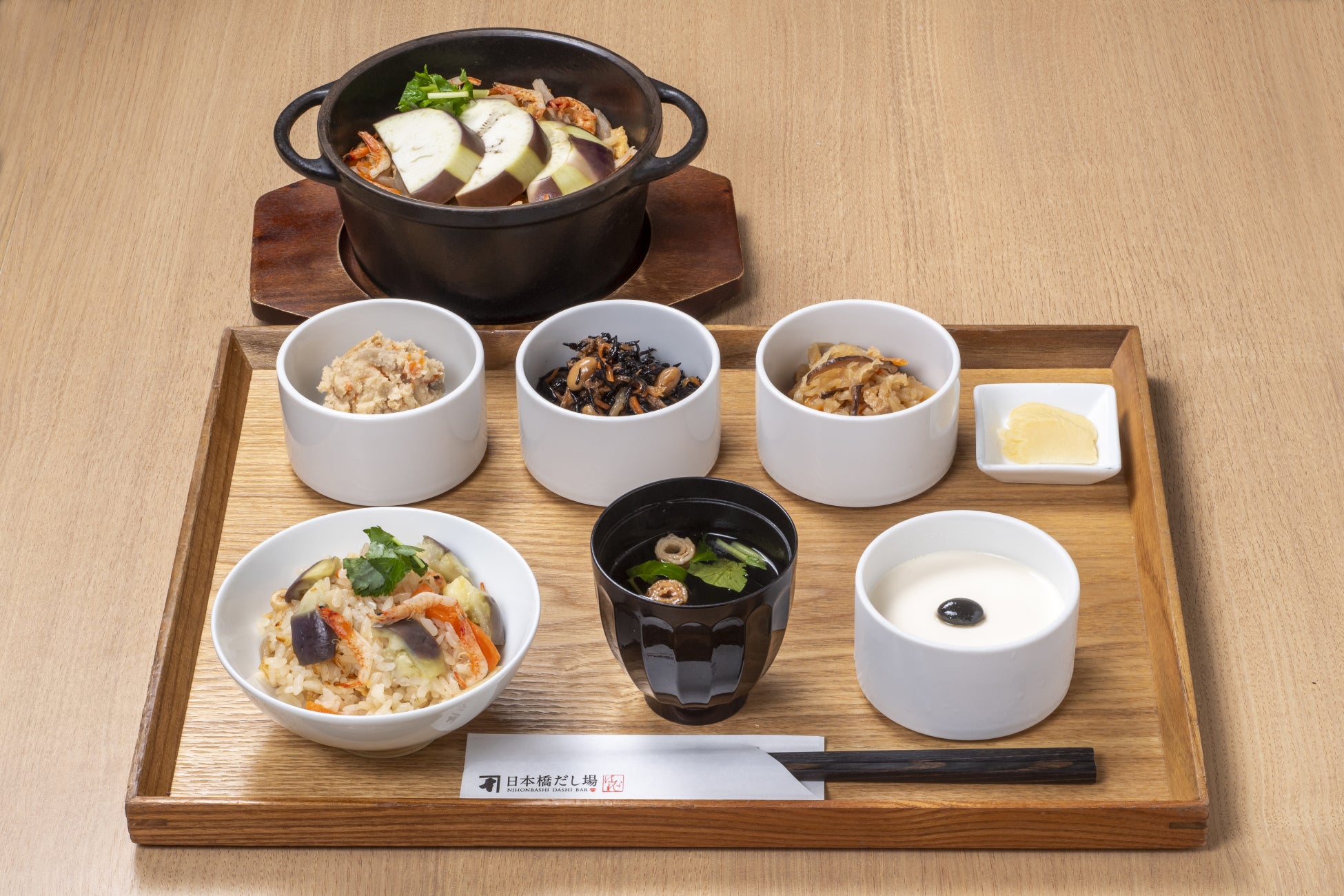 静岡で暮らした徳川家康が好んだとされる伝統野菜「折戸なす」。その「折戸なす」と「桜えび」を贅沢に使い、にんべんのだしで炊きあげたこの季節ならではのだし炊きこみご飯が楽しめます。