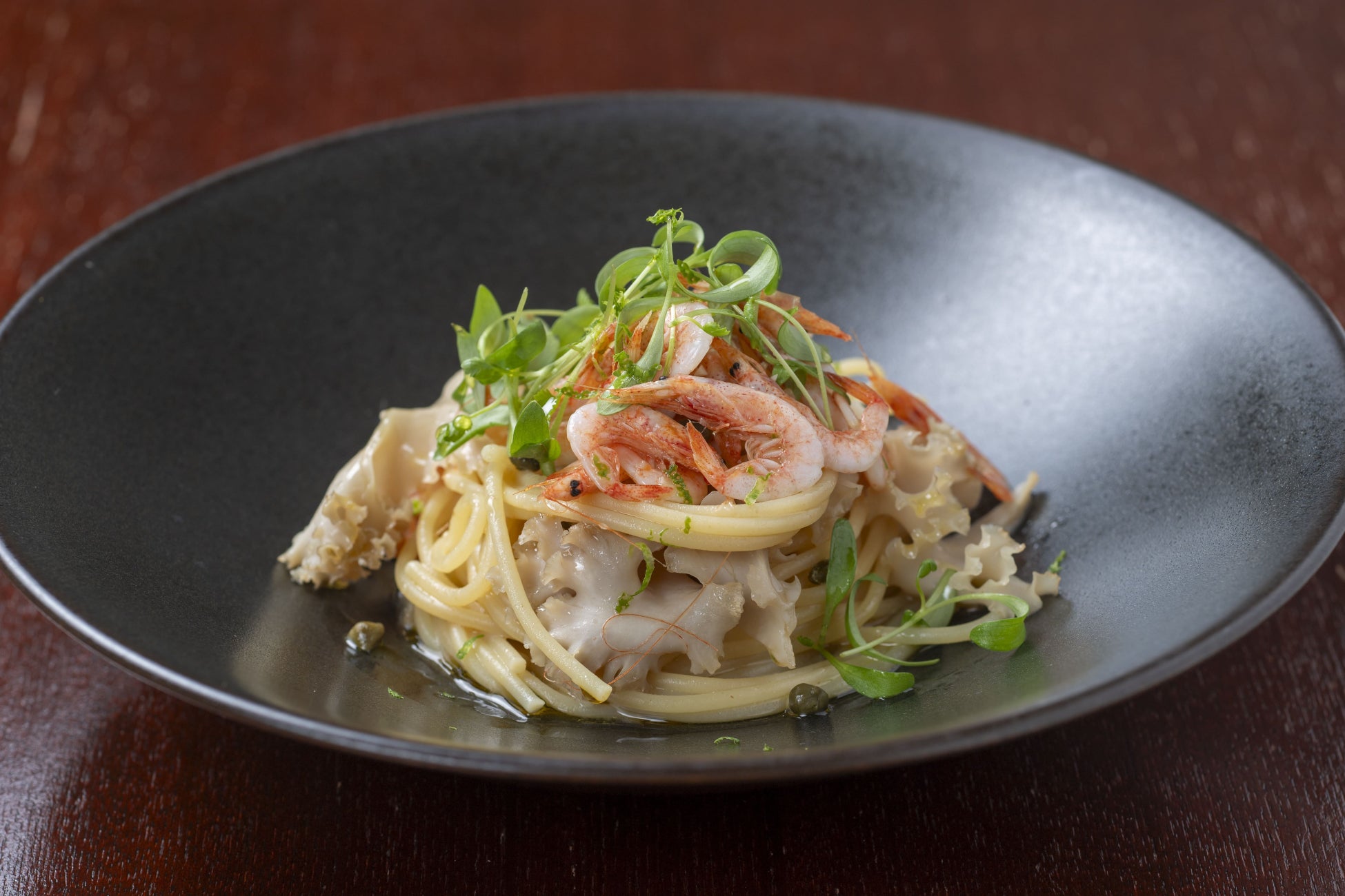 駿河湾直送の「桜えび」に「ホホホタケ」を合わせたスパゲティーニは、すだちの香味とともにお楽しみください。