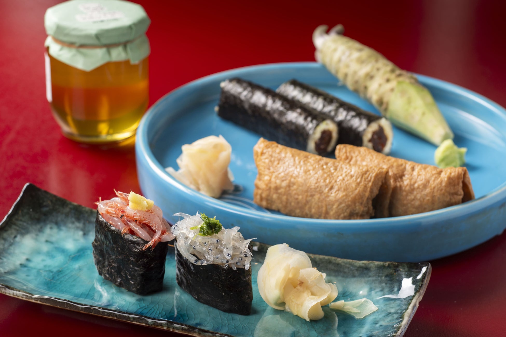駿河湾で揚がった新鮮な「生しらす」や「生桜えび」を贅沢に使った軍艦巻。「天然はちみつ」のやさしい甘みを隠し味にした蛇の市名物のいなりやかんぴょう巻も楽しめます。