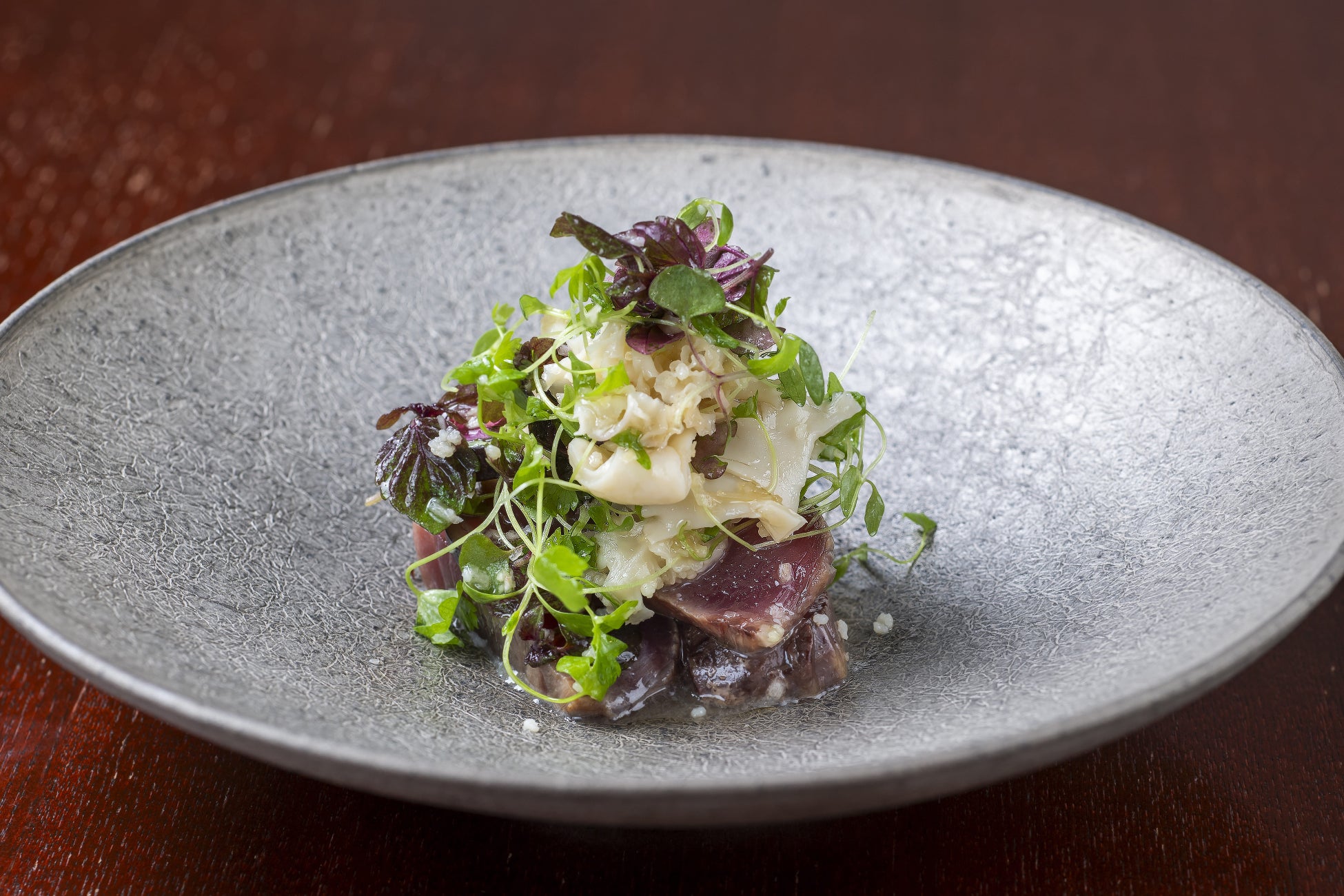 ホホホタケのマリネとカツオのあぶり はちみつドレッシング