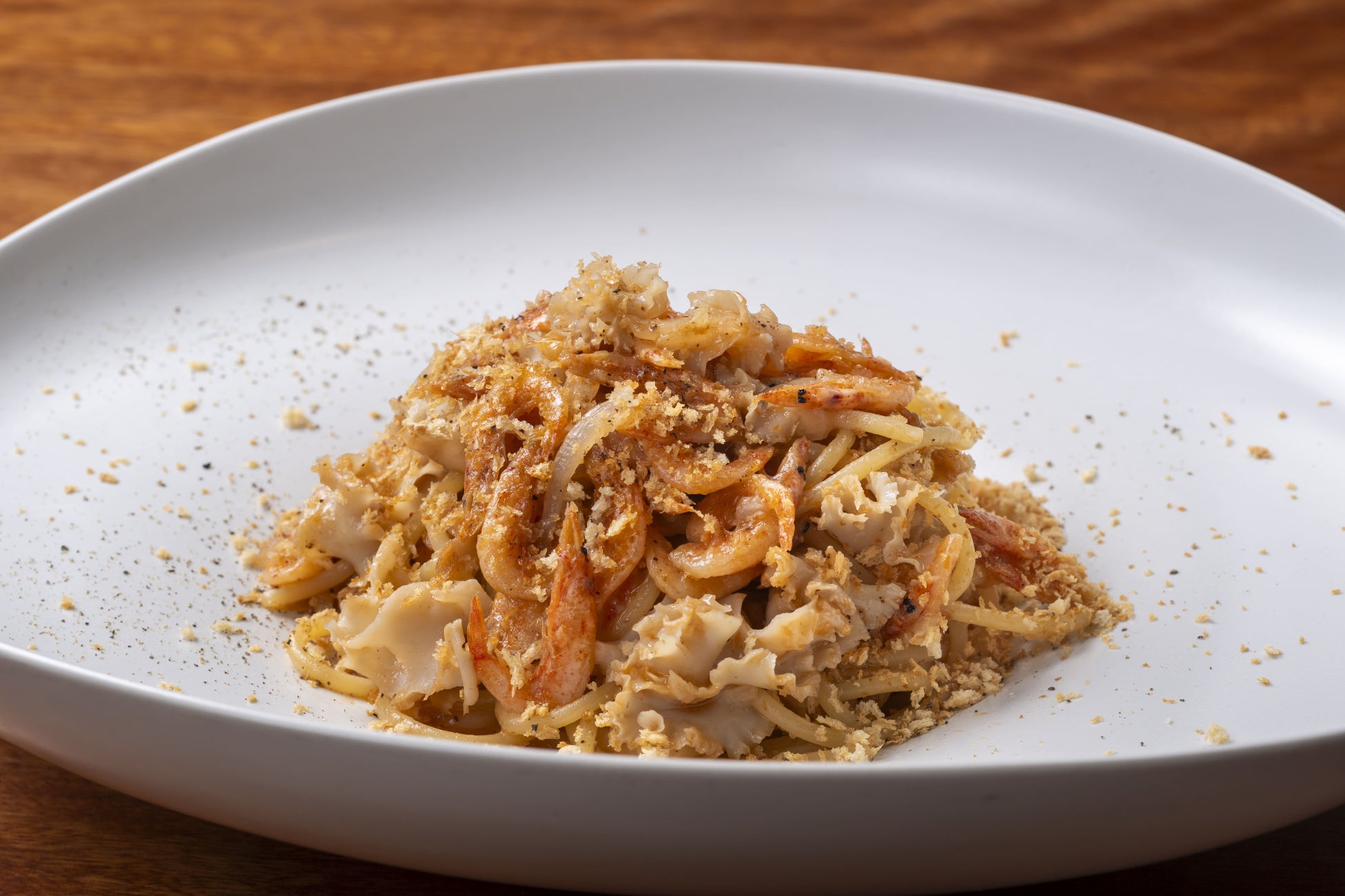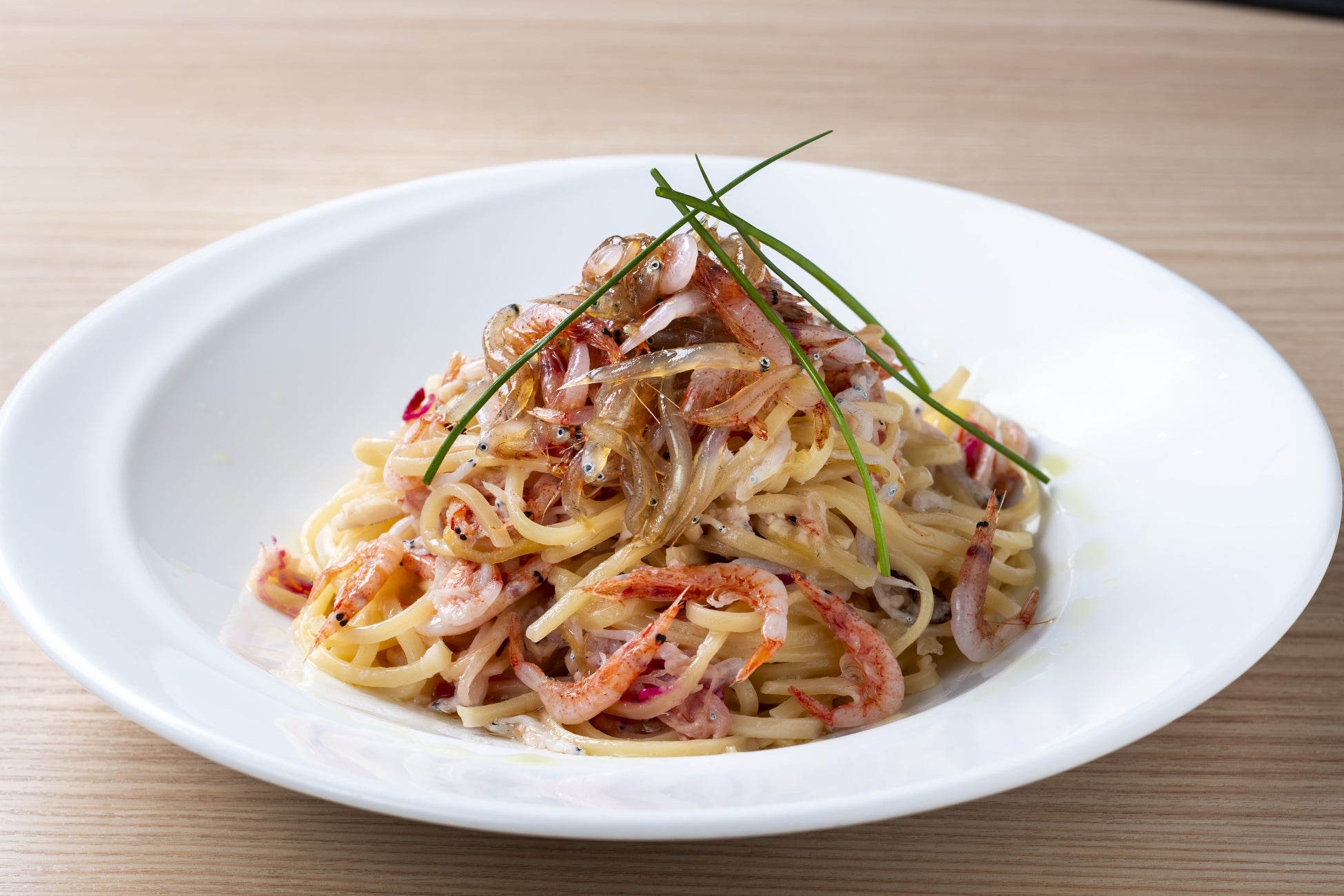 旬の「桜えび」と「しらす」をふんだんに使ったペペロンチーノ。生の桜えびとしらすをのせた贅沢な一品です。