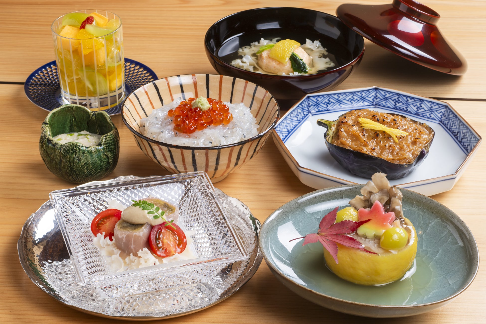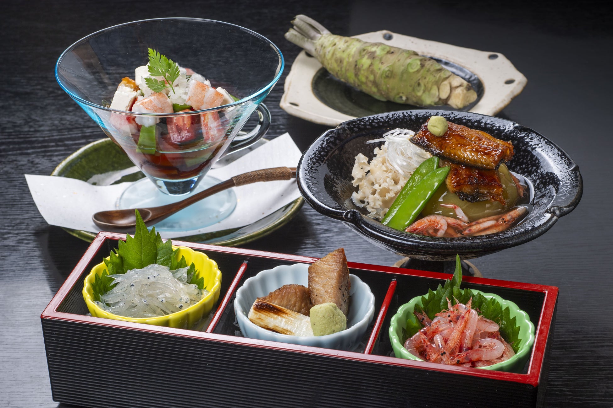 静岡市産の「本わさび」で楽しむ「桜えび」「しらす」の三種盛。「折戸なす」のひすい煮には鰻と「桜えび」、島田市直送の「ホホホタケ」を合わせました。ブランドトマトと「天然はちみつ」のドレッシングで仕上げた小鉢もお楽しみください。