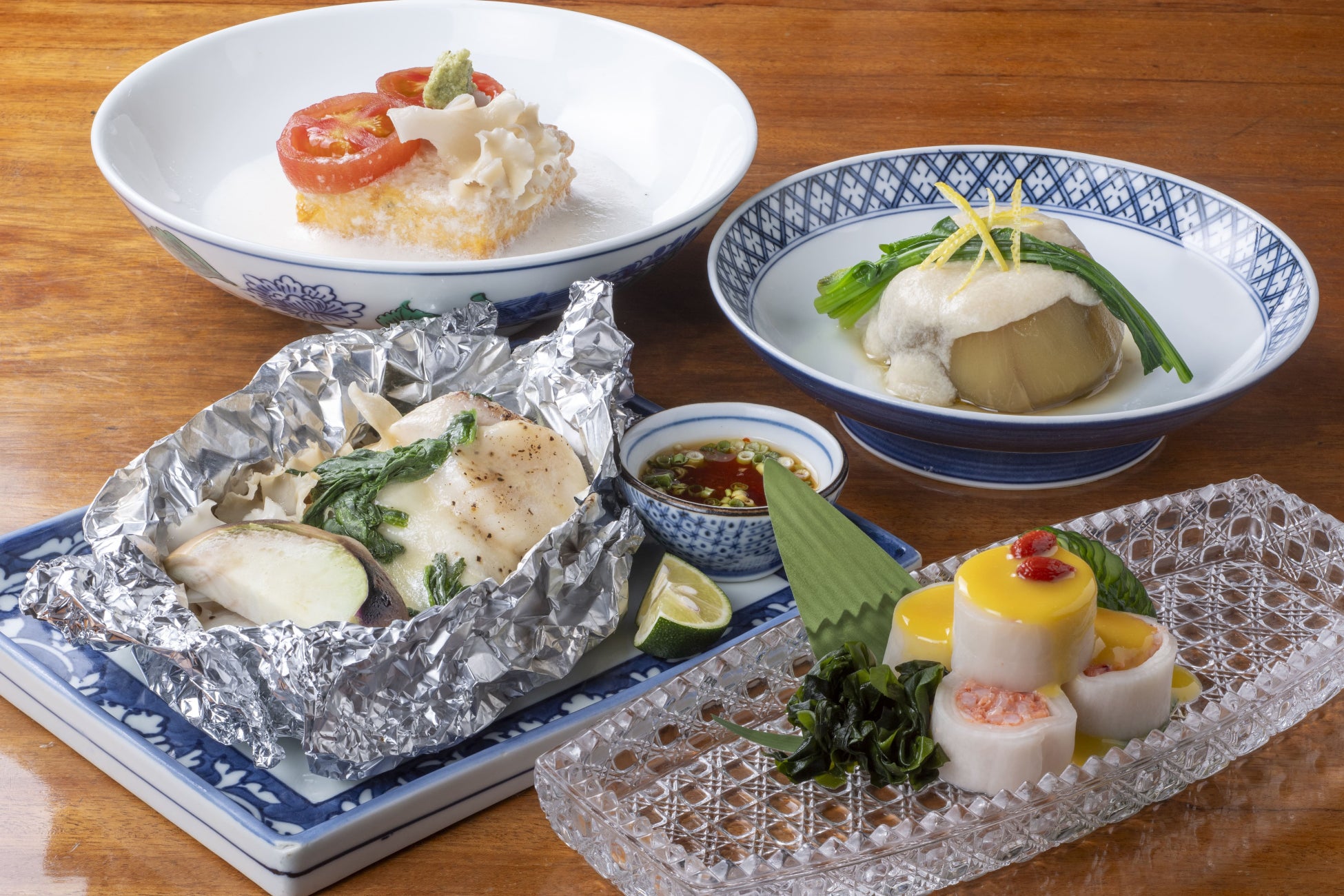 鰹のあぶりはマリネに仕立て、「ホホホタケ」と「天然はちみつ」のドレッシングを合わせました。クエの白ワイン蒸しには、香ばしく焼き上げた「折戸なす」のソースを添えています。