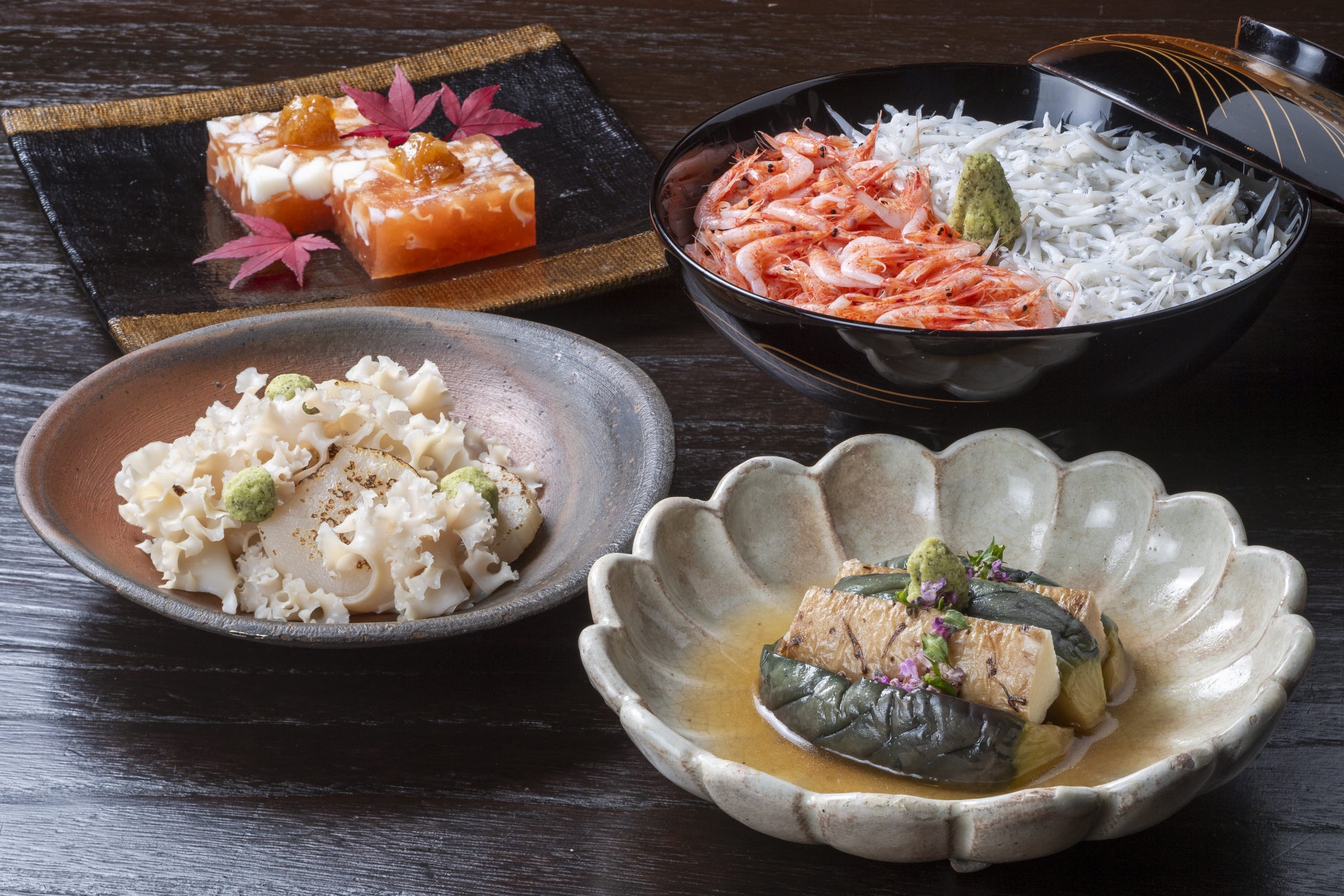 秋漁で揚がった「桜えび」に「しらす」を合わせた紅白丼は、この季節ならではの味わいです。「折戸なす」と「自然薯」は揚げびたしに仕上げました。「ホホホタケ」にはあぶりホタテを添えて、静岡市産の「本わさび」で味わうお刺身仕立てにしました。