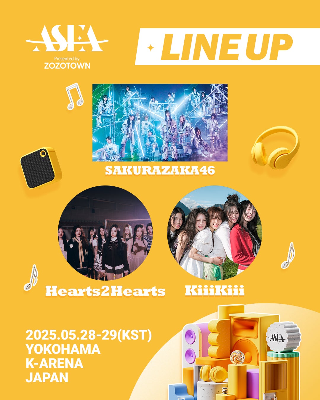 音楽とスター、そしてファンが一体となる、「ASIA STAR ENTERTAINER AWARDS 2025 in JAPAN Presented by ZOZOTOWN」(略称 ASEA 2025 Presented by ZOZOTOWN)が5月28日、29日に日本の横浜市にあるKアリーナ横浜で開催され、櫻坂46、Hearts2Hearts、KiiiKiiiが出演すると、3月31日にASEA組織委員会が公式発表した。