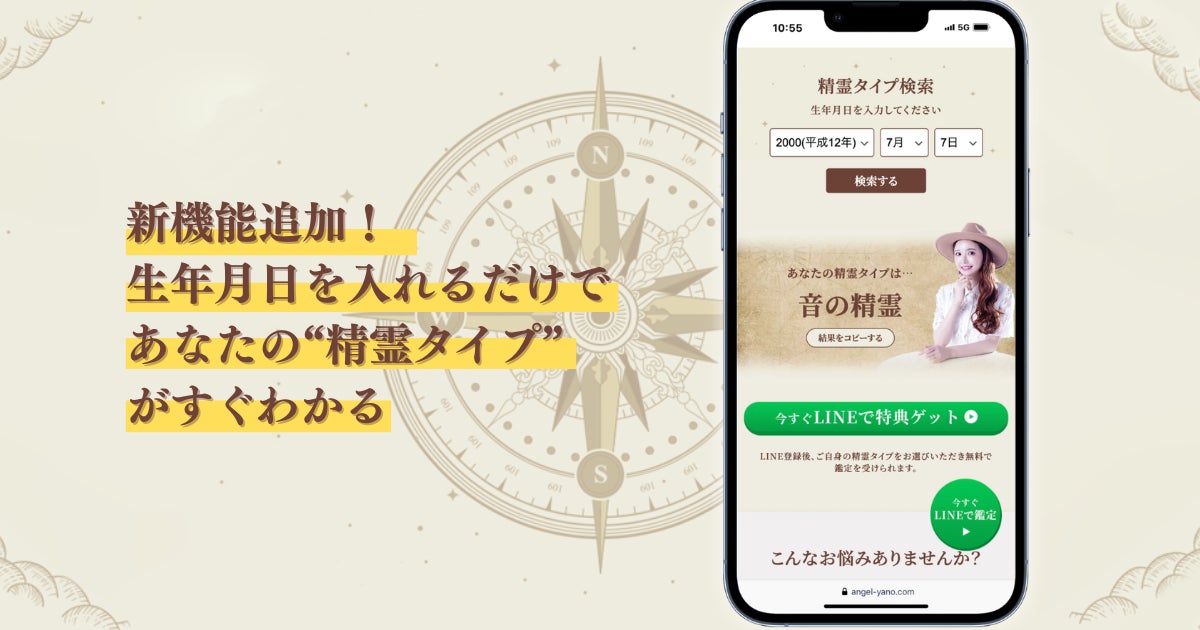 サイト上で生年月日を入力するだけで、自分の精霊タイプを簡単に診断できる新機能を導入。LINE登録を行うことで、診断結果に基づいた個別鑑定を無料で受けることができます。