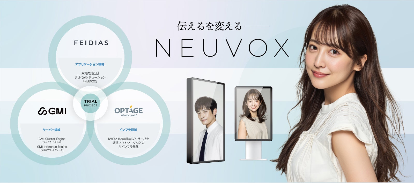FEIDIASの「AIによる高精度な動画生成・音声処理技術」、オプテージの「AIインフラのワンストップ提供力」、GMI Cloud の「AIプラットフォーム構築技術」が一体となることで、労働力不足が深刻化する日本社会に対し、AIによる革新的なソリューションを提供します。3社は「NEUVOX」を、受付、無人店舗、遠隔接客などあらゆる分野のデジタル接点に展開し、「待たされるAI」から「人間と対話できるAI」へのパラダイムシフトを主導してまいります。