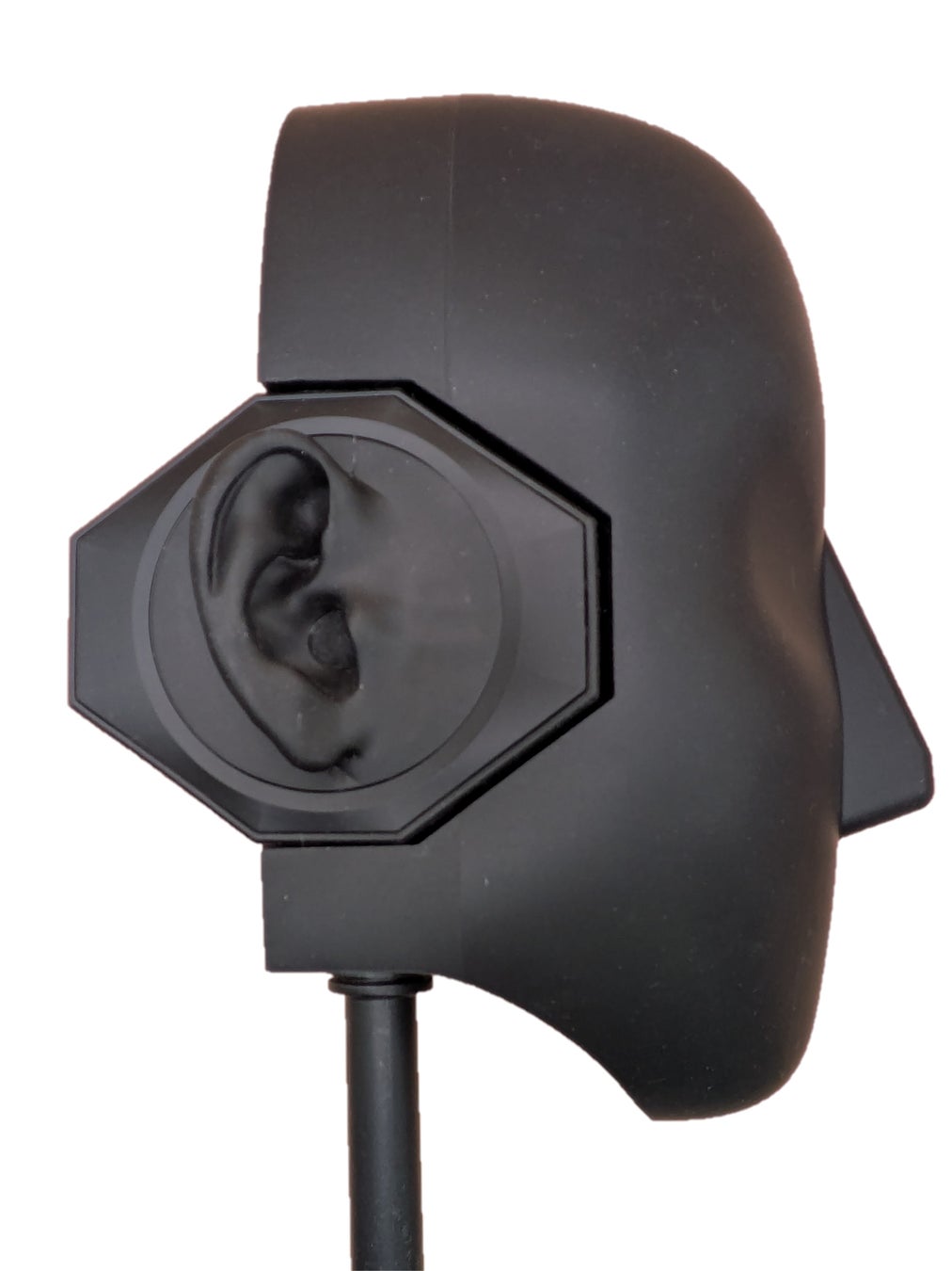 正面方向の音源から、人の耳への音の伝わり方は、音源から両耳に直接伝わる経路(直接音)の他に、顔の表面に当たり、回折して両方の耳に伝わる経路(回折音)などがあります。一般的に頭を持たない、バイノーラルマイクロフォンでは、この正面方向からの音がほとんど回折する事なく通り抜けてしまい、いわゆる”中抜け現象”と呼ばれる聴こえ方の原因になる事があります。シリコンゴム仕様のフェイスマスクは、この中抜け現象を改善し、正面方向からの音像の質を改善する効果があります。