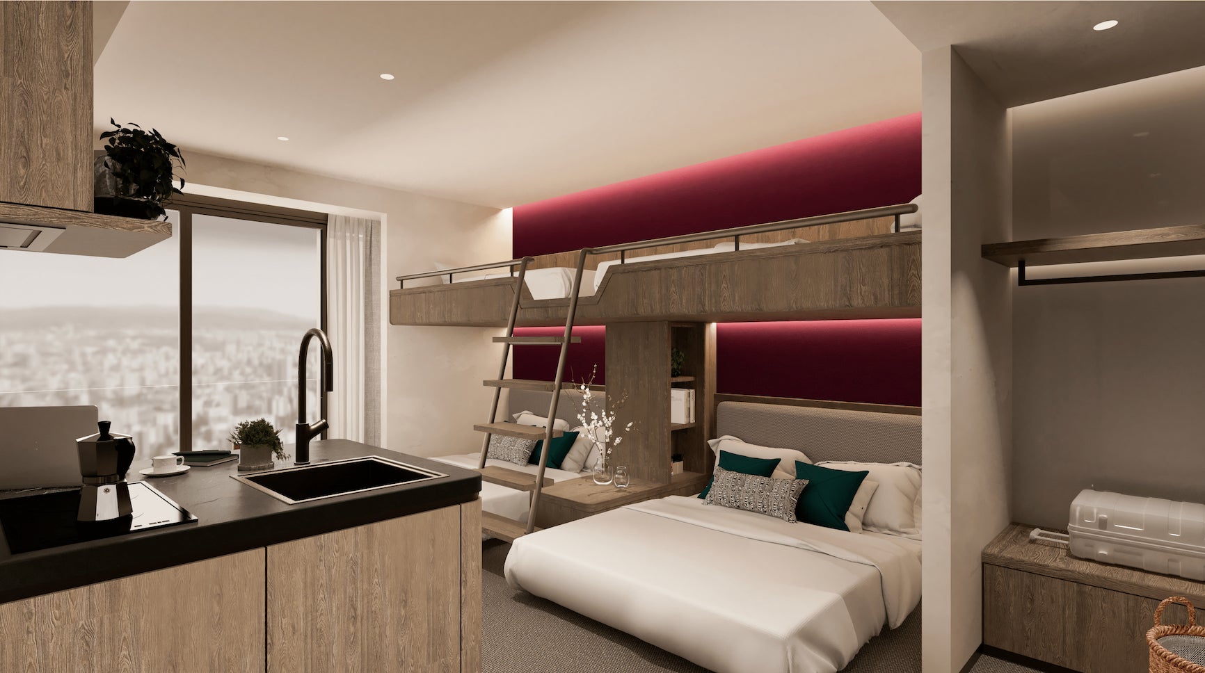 バンクベッドを有した最大6人までのグループステイが可能な広い客室や、客室内にサウナを有するスイート等、合計9タイプの客室をご用意しています。また、カフェやバーは宿泊ゲスト以外の利用も可能で、ホテルステイ以外にも多様な楽しみ方が叶うホテルとして誕生いたします。