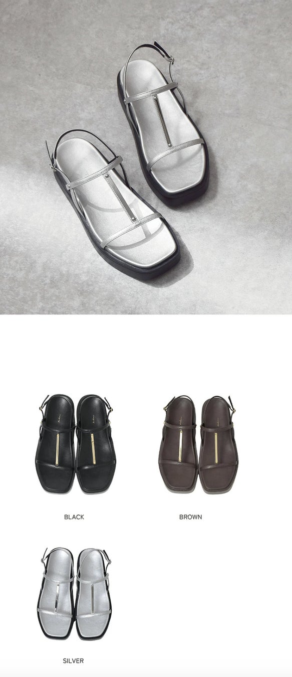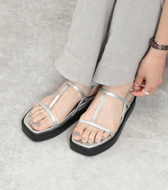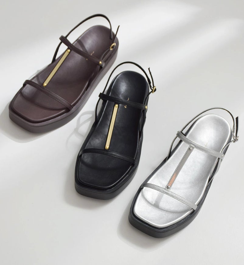 ミニマルなデザインに、Tストラップのゴールドのセンターラインがアクセントとなり、カジュアルにもエレガントにもマッチする万能な一足です。