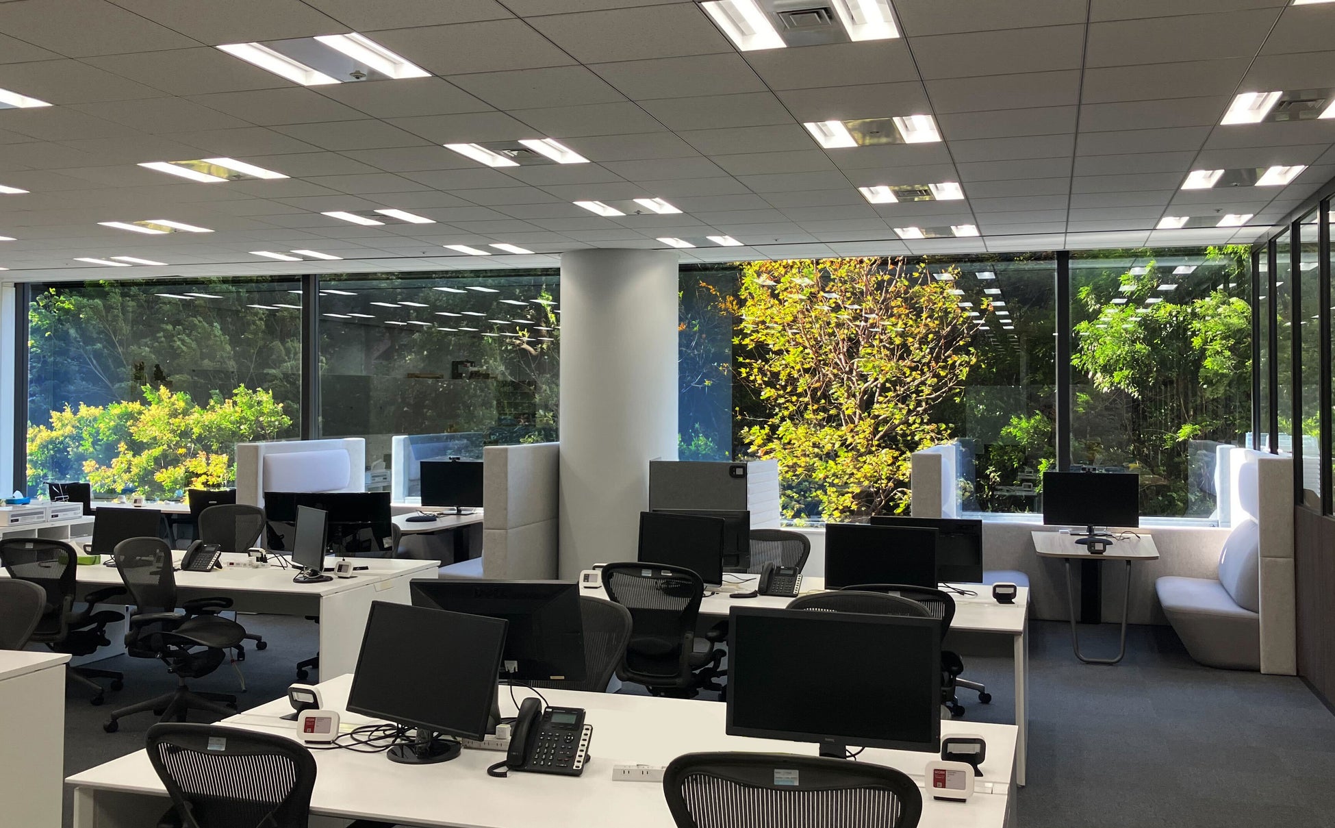 オフィス移転に伴い、当社が誇るスマートオフィスソリューションを実践的に導入することで、柔軟な働き方と高い生産性の両立を図るほか、従来以上にセキュリティを強化し、入り口からオフィス内をみると窓の向こうに一面の緑が見えるようにするなど、より快適で心地良く安心して働けるオフィスづくりを目指しています。