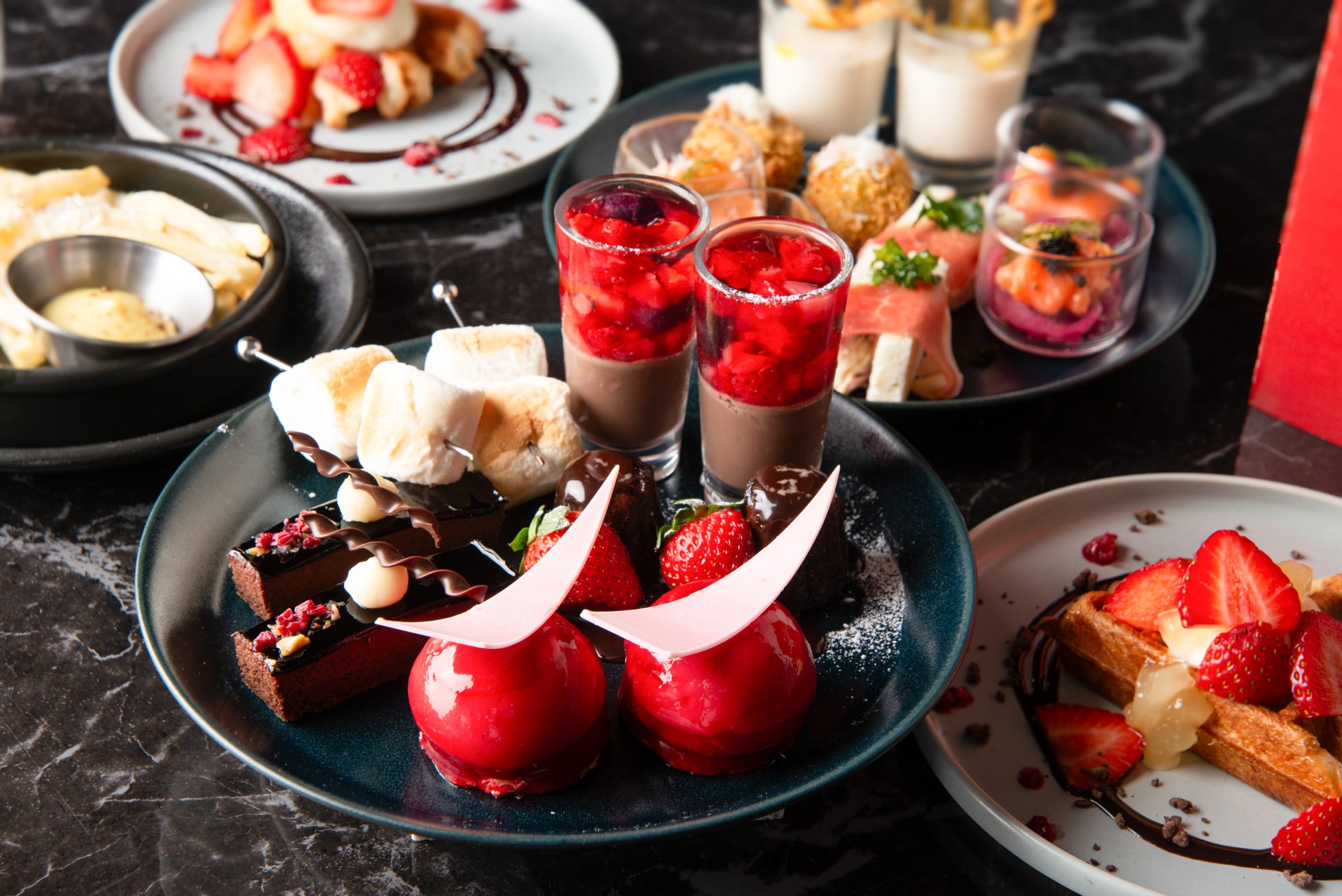 上段には、ショコラプリンと3種ベリージュレのヴェリンヌ、ルージュの宝石のようなグラサージュが美しいムース オ フレーズ、クーベルチュールのショコラケーキなど、華やかで甘美なガトーが並びます。