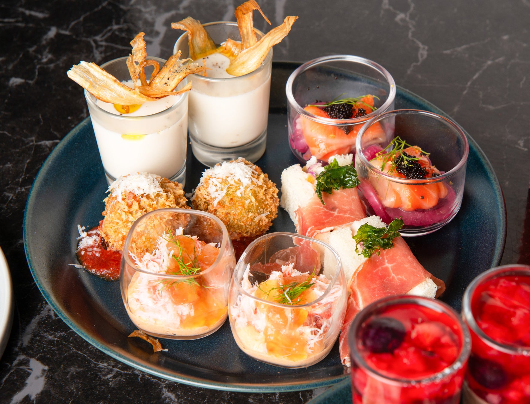 下段には、ズワイガニをあしらった人参のムース コンソメジュレや、サーモンと赤玉ねぎのマリネ、牛蒡フリットを添えたカリフラワーのポタージュなど、食べ応えのあるセイボリーが揃い、ガトーの余韻を引き立てます。