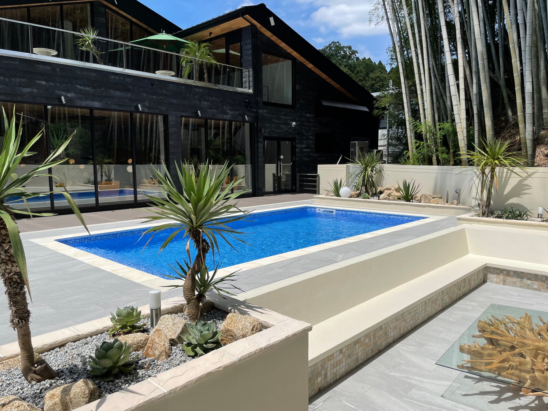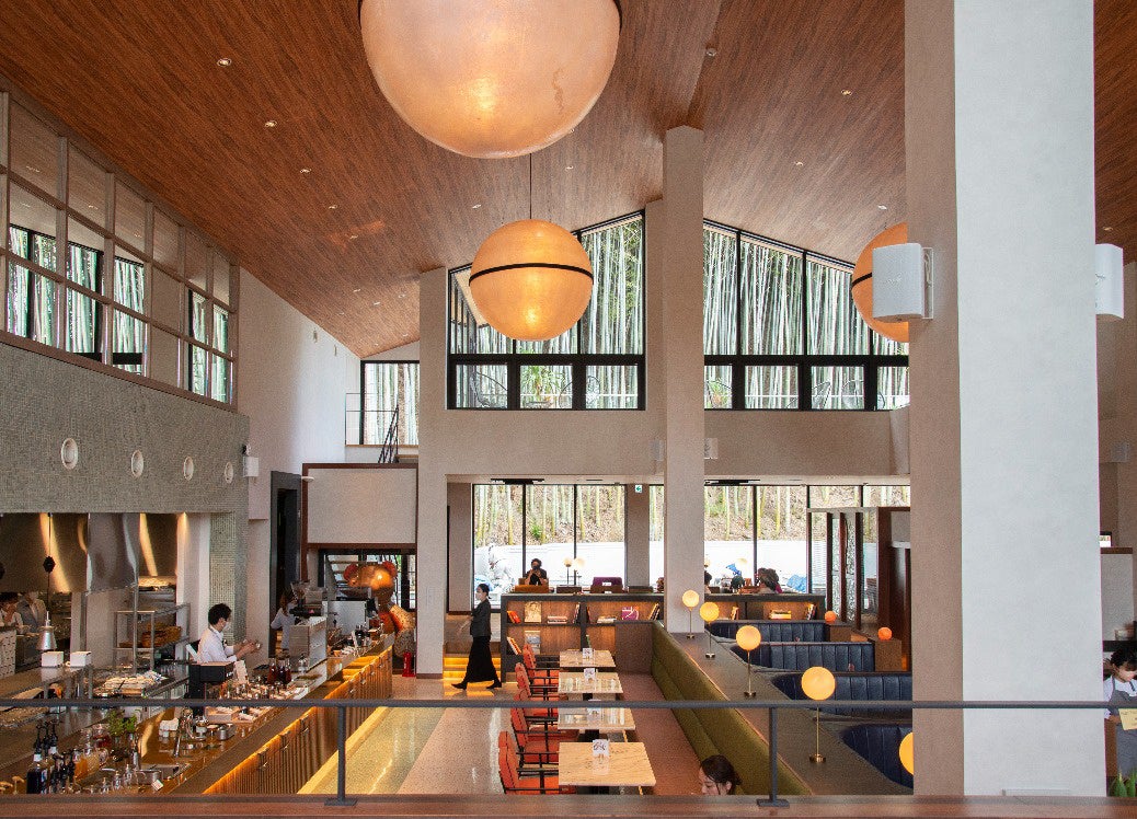 10mのビバレッジバーやライブキッチン、竹林を臨むスカイテラスとプールサイドデッキがあり、室内にいながら開放感満載。季節ごとに見せる竹林の風情も感じられ運が良ければ鹿に会えることも。