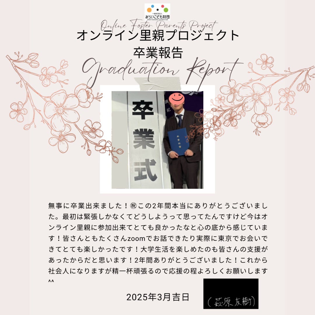 一般財団法人みらいこども財団(所在地:大阪、代表:谷山昌栄)は、児童養護施設を卒園し、大学や専門学校へ進学する学生を、複数の大人がチームで支える独自の給付型奨学金制度「オンライン里親プロジェクト」の2026年度支援学生の募集を開始しました。