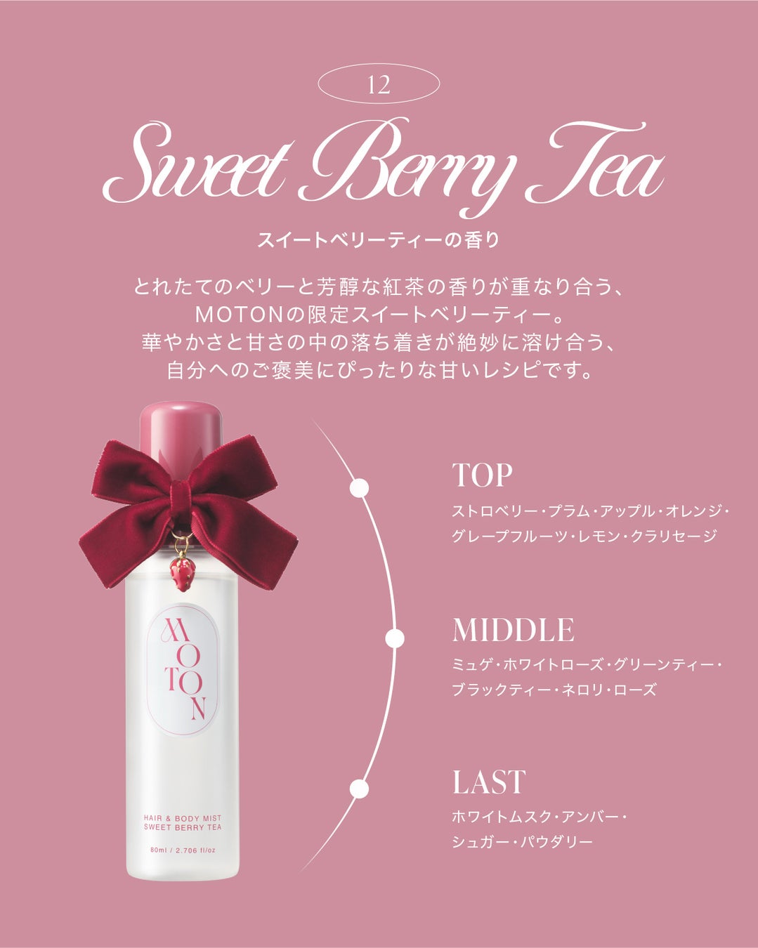 「MOTON」の大人気ヘア&ボディミストから数量限定で「SWEET BERRY TEA」の香りが登場!12月5日より全国で発売開始