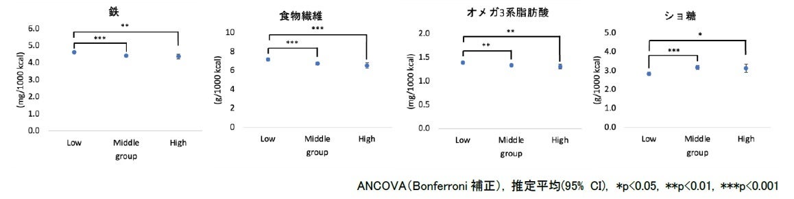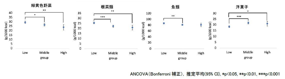 栄養素摂取量と同様に、3群における食品摂取量を比較すると、緑黄色野菜(Middle, p=0.015; High, p=0.005)、根菜類(Middle, p<0.001; High, p=0.001)、魚類(Middle, p=0.008; High, p=0.249)の摂取量がLow群と比較してMiddleおよびHigh群で低く、洋菓子(Middle, p<0.001; High, p=0.041)の摂取量が多いという結果になりました。食物繊維の摂取源は特に、にんじん、かぼちゃ、緑葉野菜を含む緑黄色野菜と、大根やかぶを含む根菜類であることが示唆されました。また、不定愁訴が多い群では菓子類の中でも特にクッキーやビスケットを含む洋菓子の摂取量が多いことが明らかとなりました。