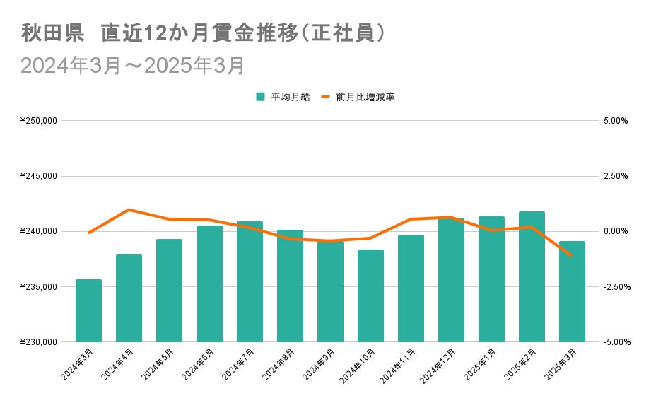 秋田県では、2024年3月から2025年3月まで目立った増減はなく、前月比増減率は-1%~+1%の範囲で推移しています。