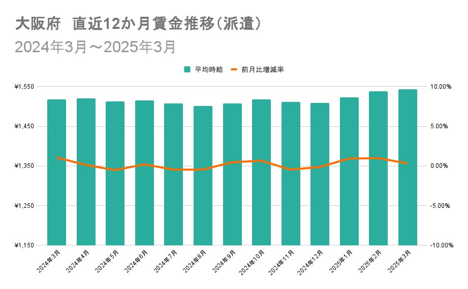 1位の大阪府と47位の島根県における直近12か月の賃金推移を比較すると、大阪府は1,500円以上の平均時給を維持しながら横ばいで推移しました。