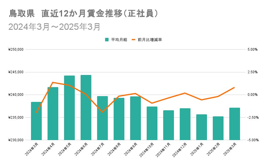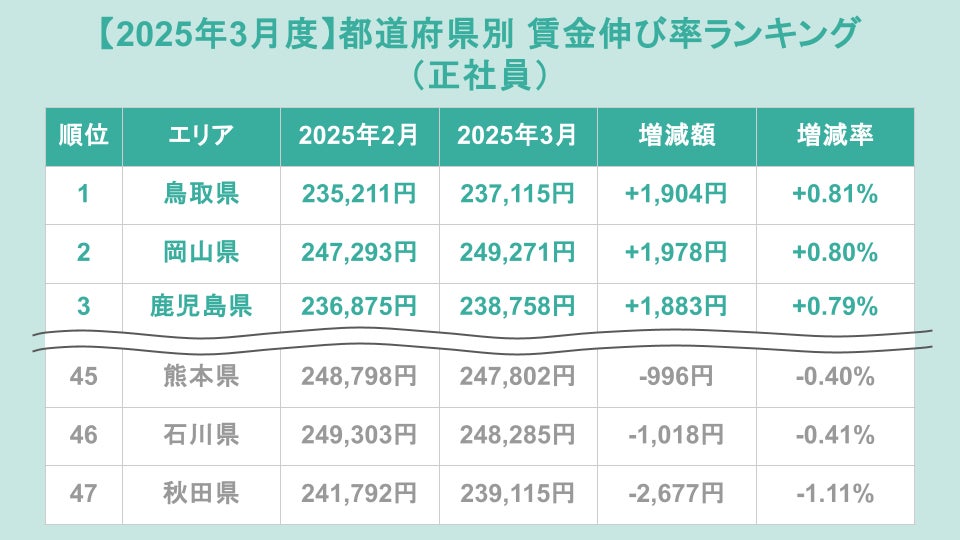 正社員の都道府県別賃金伸び率ランキング(前月比)トップ3は、1位が鳥取県(増加額+1,904円、増加率+0.81%)、2位が岡山県(増加額+1,978円、増加率+0.80%)、3位が鹿児島県(増加額+1,883円、増加率+0.79%)でした。