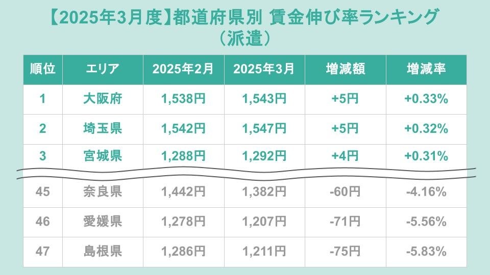 派遣の都道府県別賃金伸び率ランキング(前月比)トップ3は、1位が大阪府(増加額+5円、増加率+0.33%)、2位が埼玉県(増加額+5円、増加率+0.32%)、3位が宮城県(増加額+4円、増加率+0.31%)でした。