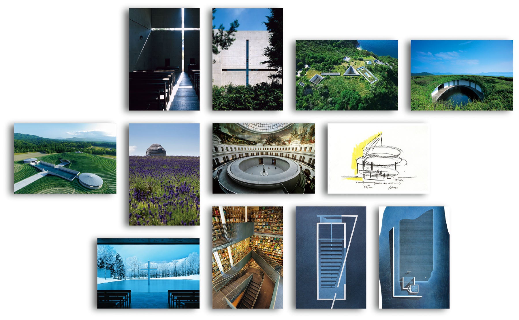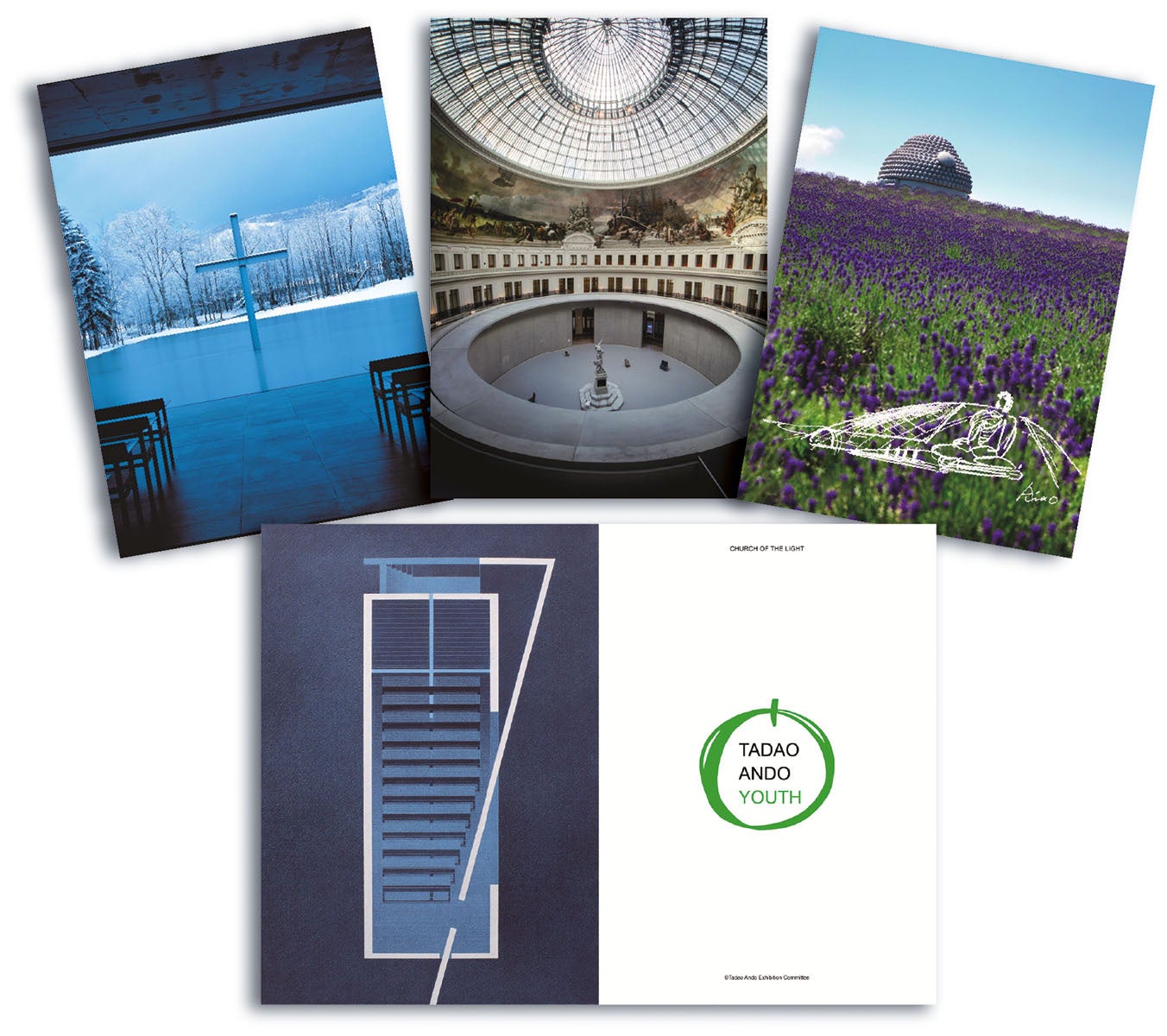 代表作(水の教会、光の教会、真駒内滝野霊園頭大仏、ブルス・ドゥ・コメルス)が美しくデザインされた4種展開。人工と自然、歴史と現代、幾何学と光──安藤建築の美しいコントラストが映えるクリアファイルです。
