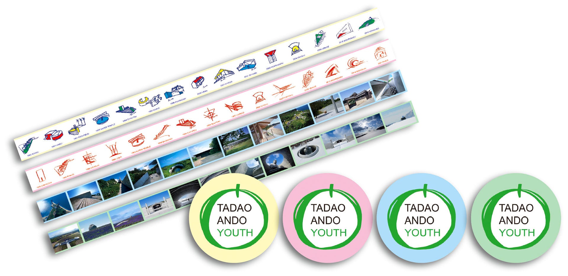 安藤忠雄氏が自ら描いた代表作30のスケッチを並べたデザインと、展覧会のアイコンともいうべき青リンゴのスケッチをモチーフとしたデザインの2種展開。青リンゴパターンには、安藤氏オリジナルの似顔絵ハンコを添えています。