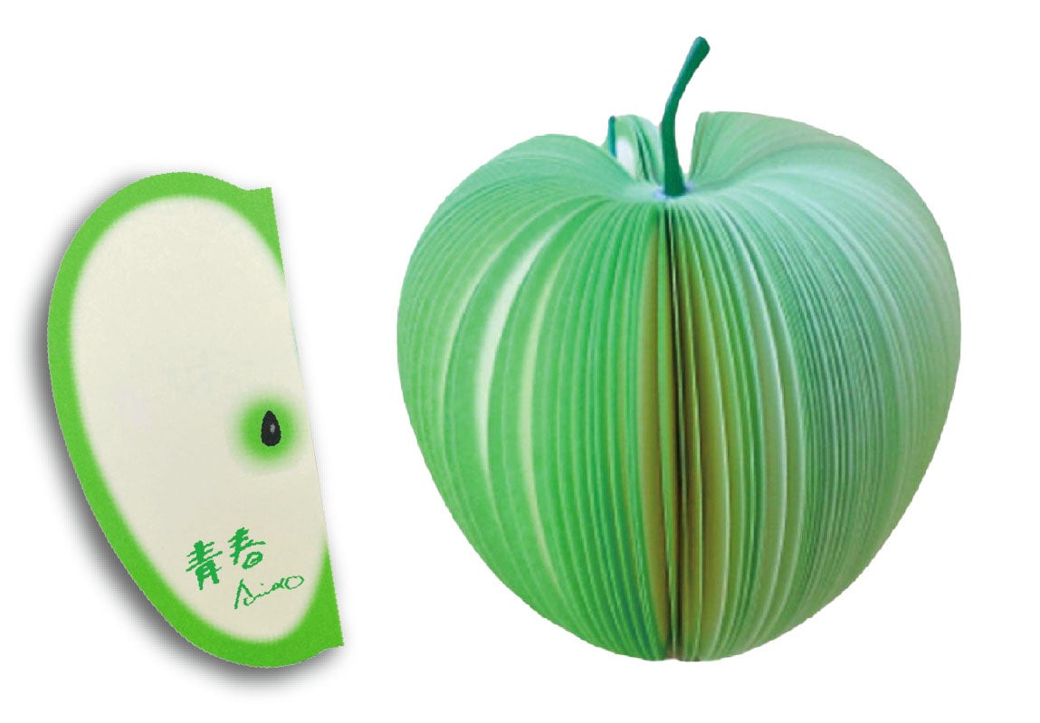 組み立てると、原寸大の青リンゴに!メモ帳の中面には、安藤忠雄氏直筆の「青春」の文字が刻まれています。