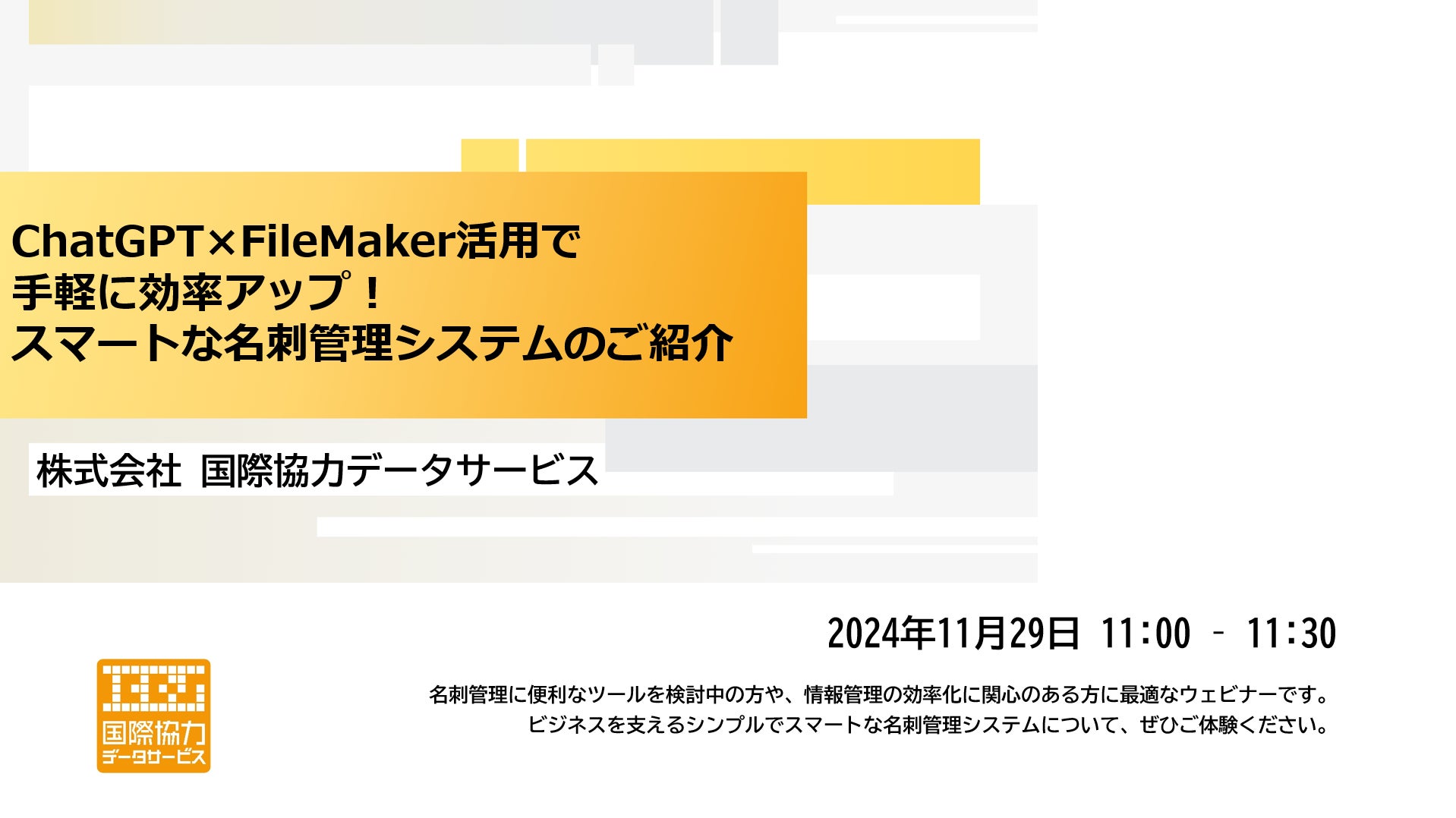 株式会社国際協力データサービス(ICDS)、ウェビナーの配信を開始(「ChatGPTを利用した画像情報管理 FileMaker「名刺管理システム」のご紹介」11月29日(金)11:00~11:30)