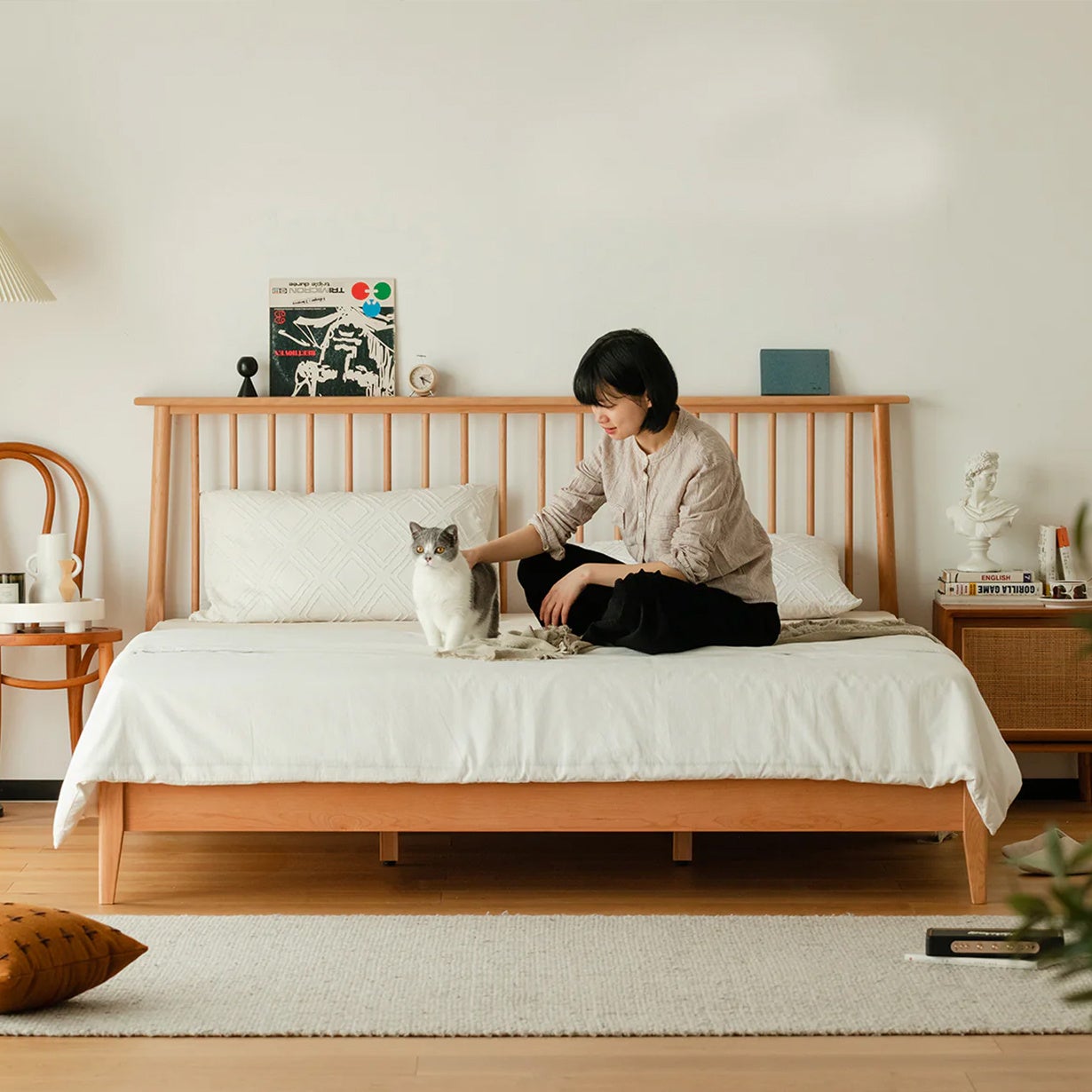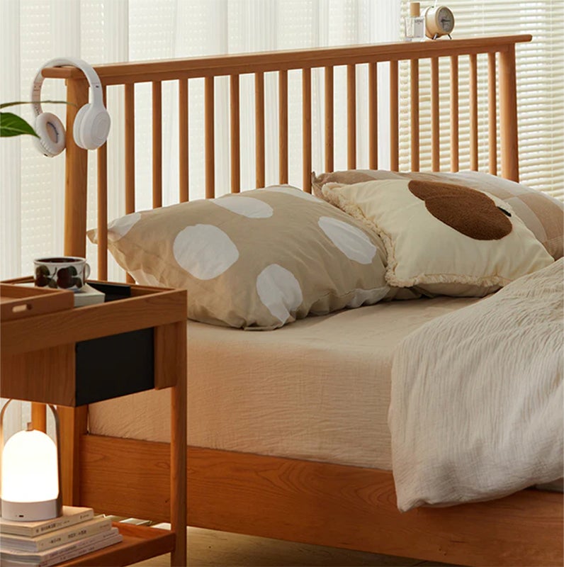 エレガントな雰囲気とレトロな風合いが調和したワンアイテム。厚手で頑丈な木材を用いたベッドフレームは安定感があり、質の良い睡眠をもたらします。高さ71cmのベッドボードはしっかりと体を支え、絶妙な間隔を開けることで一層背中や腰を快適にサポート。後ろに貼られたフェルトシートで壁を保護してくれるもの魅力的なポイントです◎