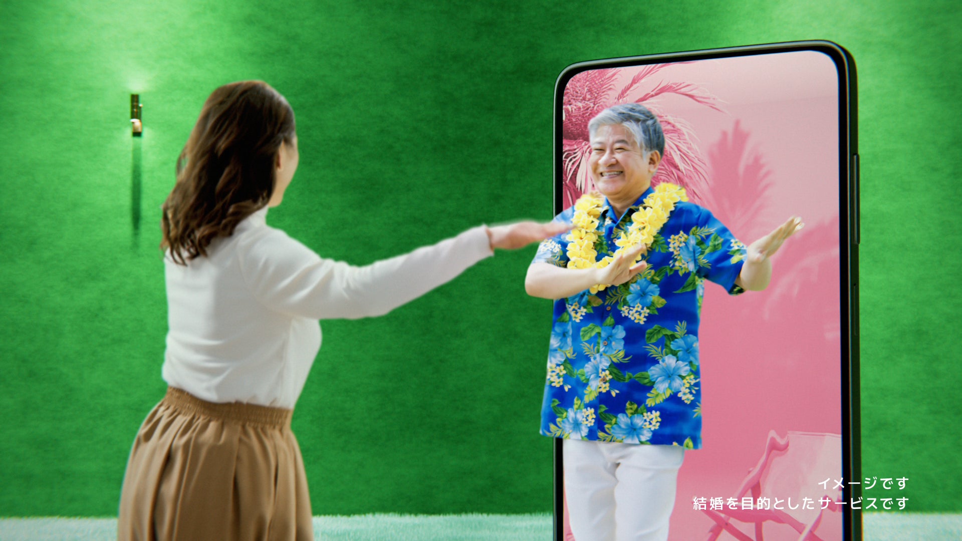 “共通の趣味”に合わせて、ワイン好きの男性には“いけてる!”、カラオケ好きの男性には“ハモれる!”、ペット好きの男性には“もふもふ!”とテンポよくマッチングの楽しさを表現。さらに、フラダンス好きの男性が現れると“イエ〜イ!ホノルル〜”と踊り始め、男性も画面の中から飛び出して二人で一緒にフラダンス。