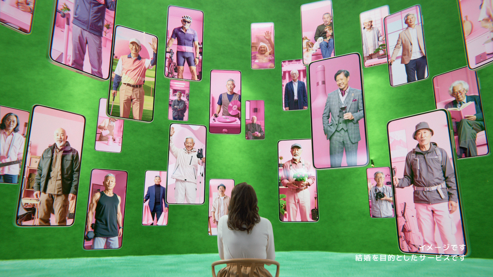 今回放映を開始したテレビCMでは、ハハロルを開いた女性の前に、共通の趣味を持つさまざまな男性たちが次々と現れ、出会いが広がっていく様子をコミカルかつテンポよく描いています。ワイン、カラオケ、ペット、フラダンスなど共通の趣味をきっかけに相手とつながれる楽しさを通じて、年齢にとらわれず新たな出会いに踏み出せることを、明るく親しみやすい世界観で表現した内容です。