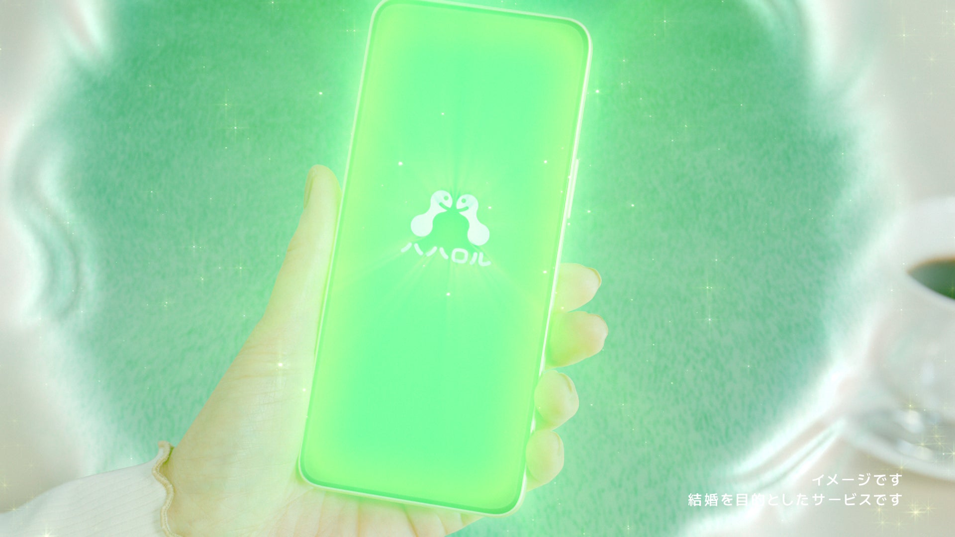 スマートフォンに表示された「ハハロル」の文字を見た女性がアプリを開くと、目の前にスマートフォン画面が次々と現れ、さまざまな男性との出会いが広がっていきます。
