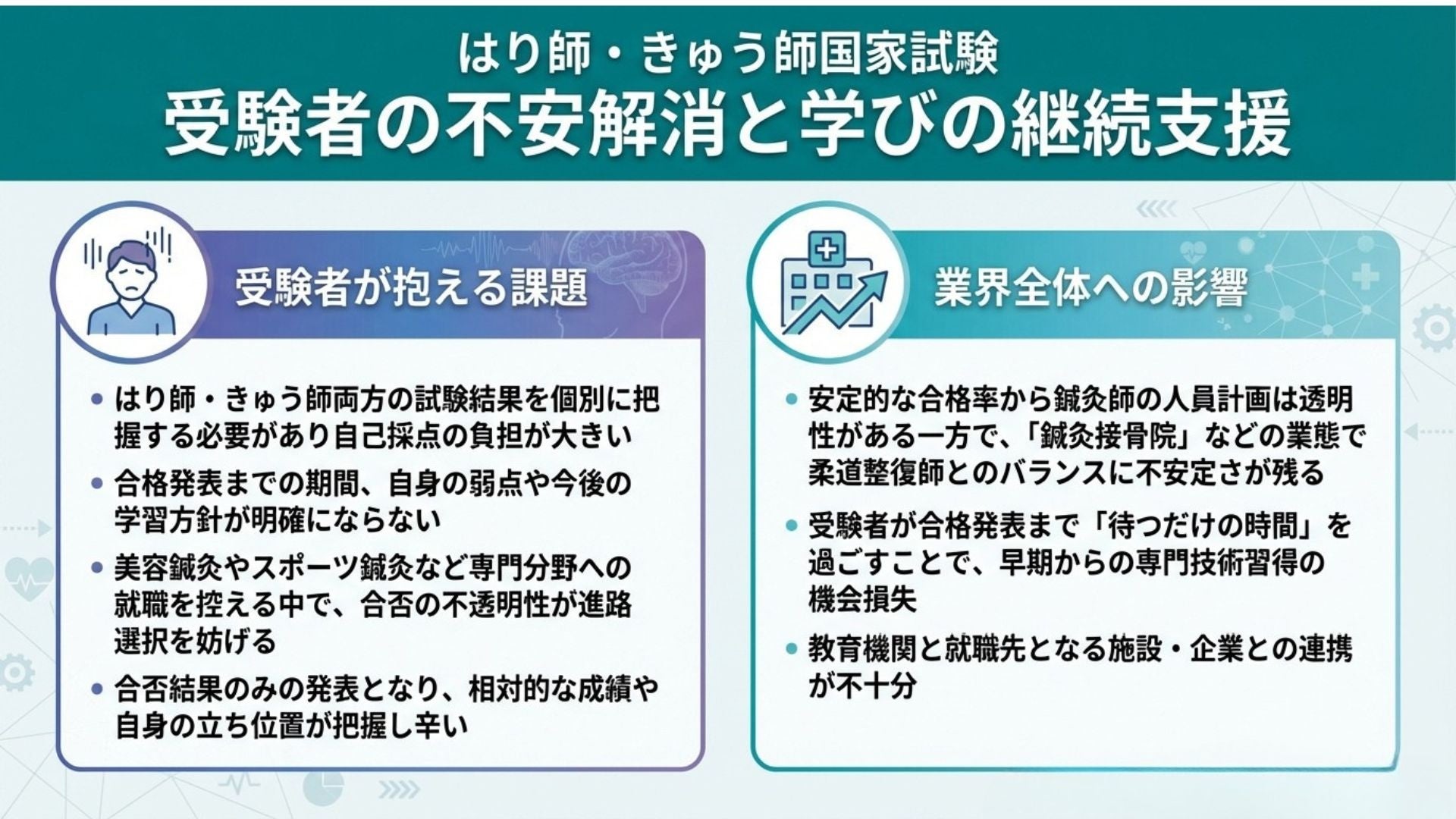 はり師・きゅう師国家試験においても、試験後から合格発表までの期間、受験者が抱える不安や課題は深刻です。特に、はり師・きゅう師の両方を同時受験する場合、試験科目数も多く、自己採点や振り返りの負担が大きくなります。