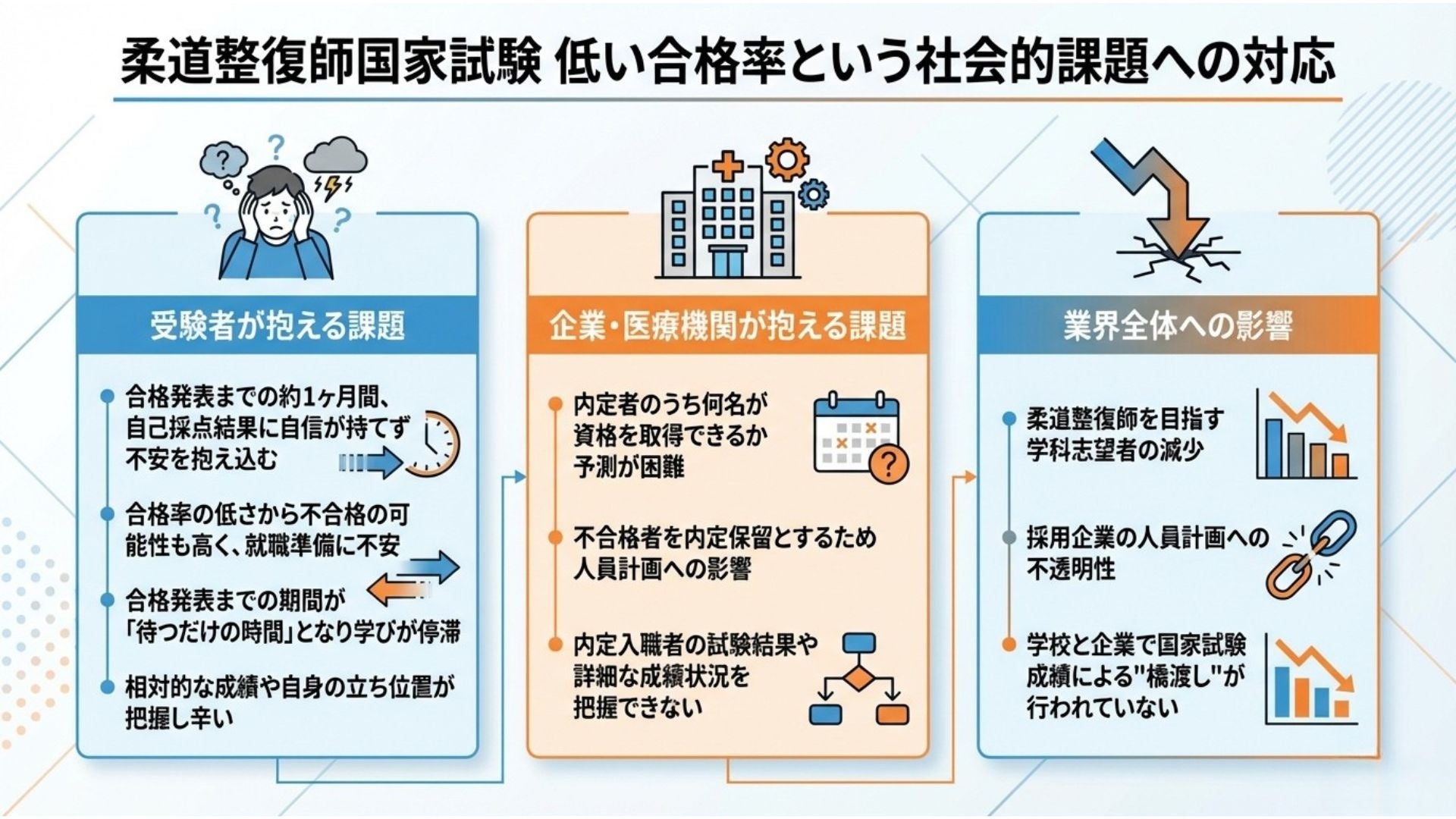 柔道整復師国家試験は、長年合格率が低いことにより、医療業界全体にとって深刻な社会的課題と言える状況が続いています。この合格率の低さは、受験者・企業・業界全体に以下のような影響を及ぼしています。