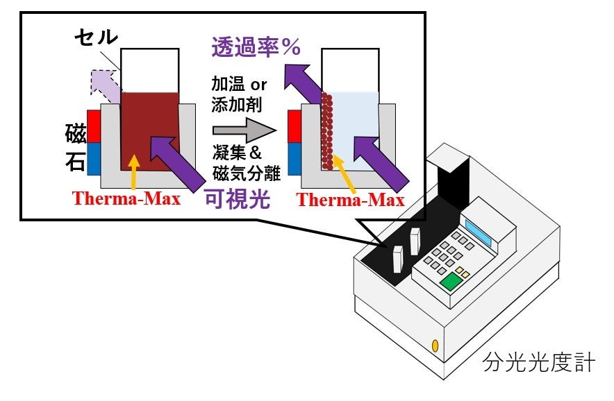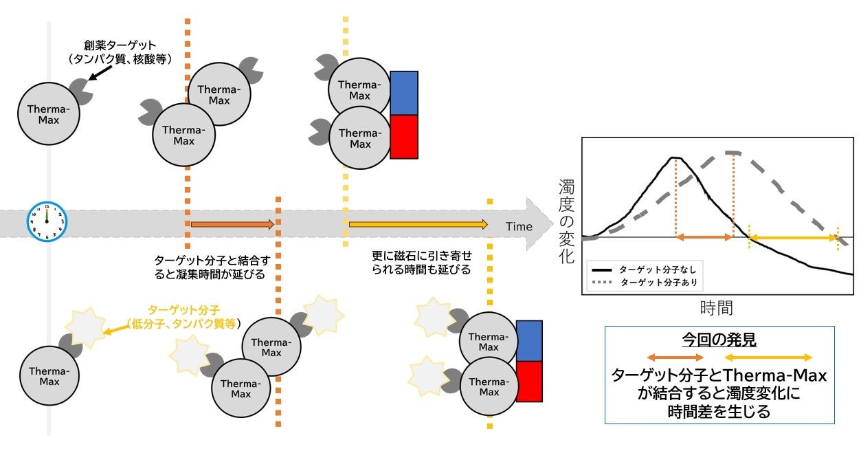 今回の発明のきっかけは、当社の独自製品である刺激応答性磁性ナノ粒子(商標名:Therma-Max🄬)に抗体等のタンパク質を結合させると、濁度変化に時間差があったという発見からでした。