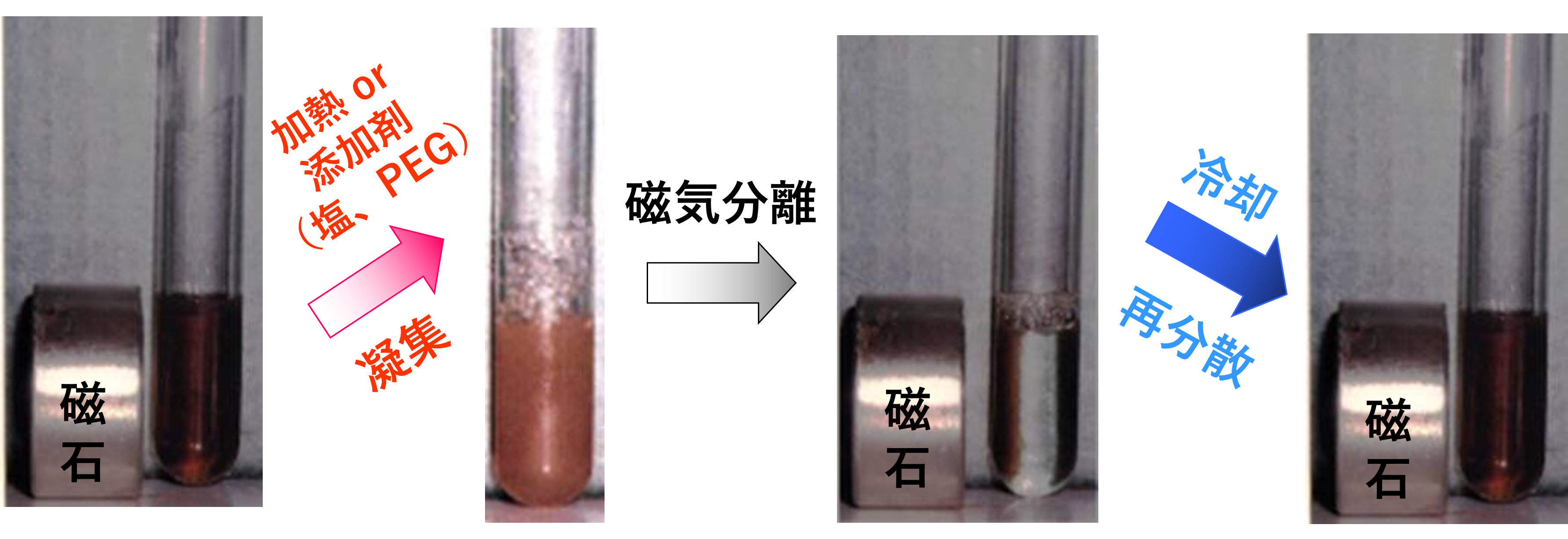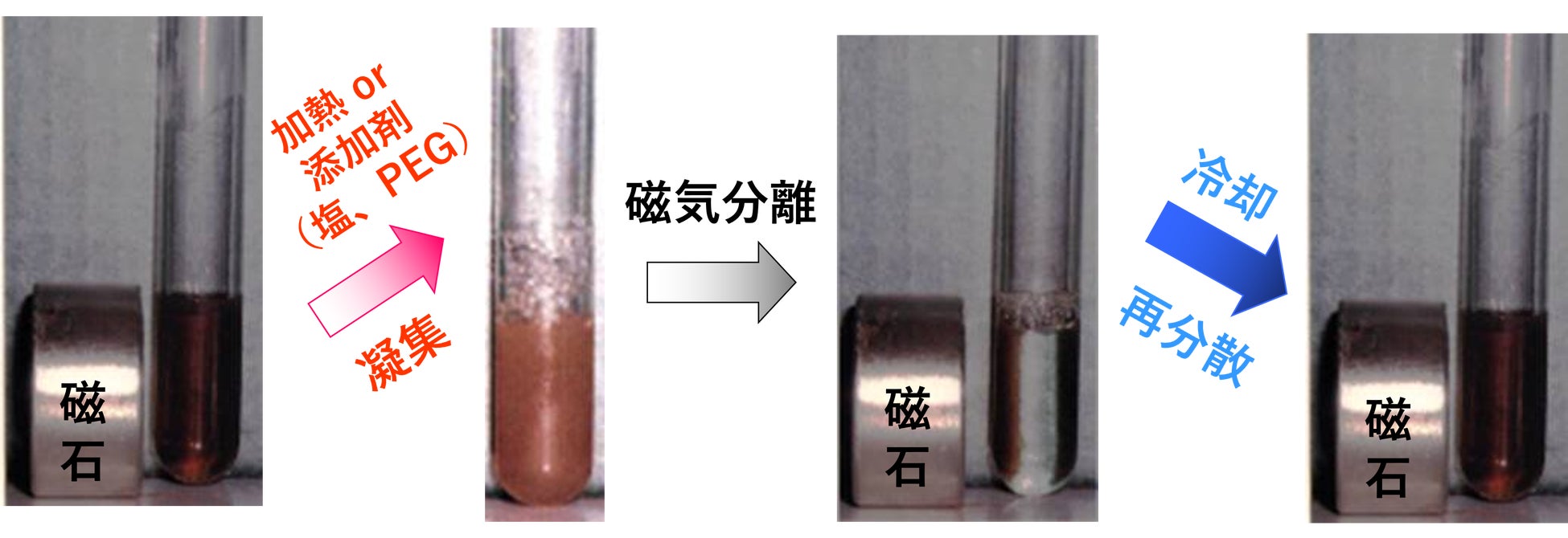 このトレードオフの関係を解決するため当社は、温度変化(30℃で可逆的に相転移)や僅かな添加剤(塩、PEG(ポリエチレングリコール)等)で、可逆的に凝集と分散を繰返す粒子径が約100ナノメートルの刺激応答性磁性ナノ粒子(Therma-Max(サーマ・マックス)、Vira-Max(バイラ・マックス))の製品化に成功しました(粒子径が小さいため濾過滅菌も可能)。