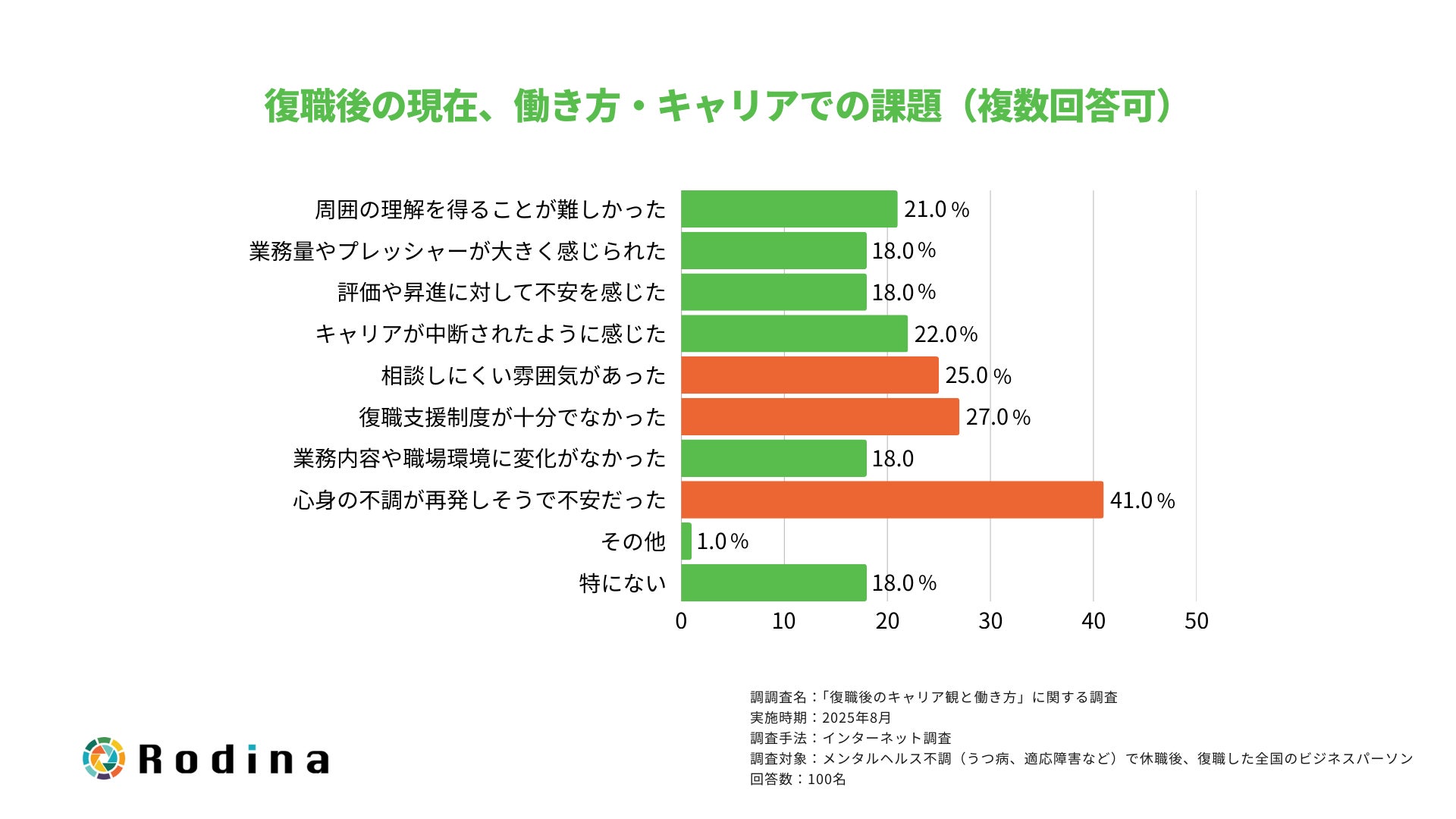 ・復職後の課題は「心身の不調の再発が不安」(41%)、「復職支援制度の不足」(27%)、「相談しにくい雰囲気」(25%)