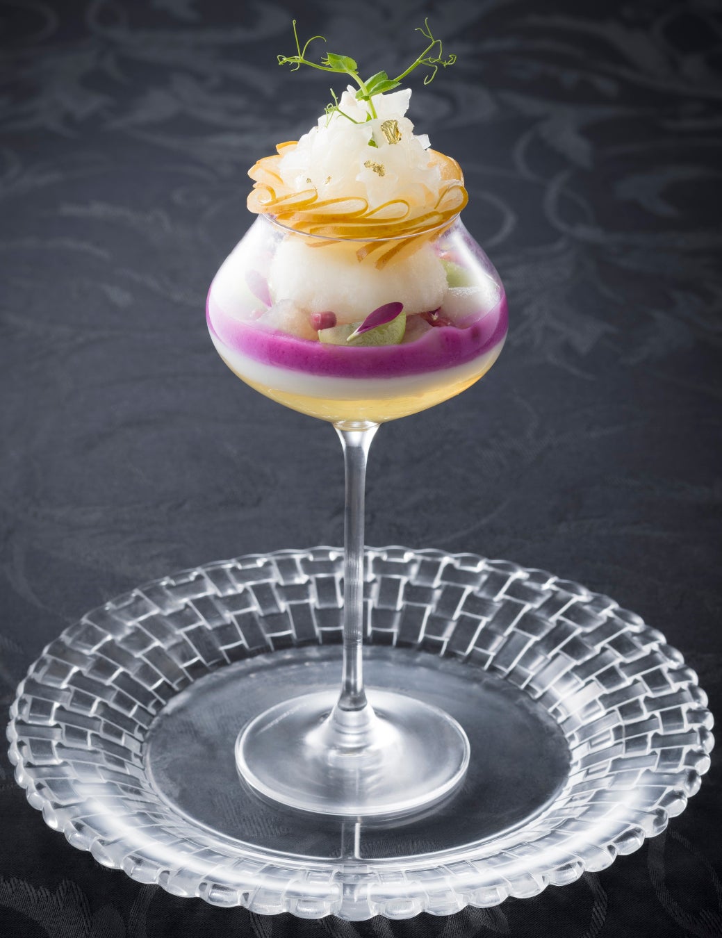 梨をふんだんに使用し、金木犀の香りを白ワインにうつした桂花陳酒が香る、贅沢な中華風パフェ。桂花陳酒のゼリー、クリーミーな杏仁豆腐、紫の菊の花のソース、梨のコンポート、ザクロ、シャインマスカット、梨とライチのシャーベット、白きくらげ等、多種多様な味わいが楽しめる逸品です。皮膚や粘膜の乾燥を潤すと言われている白きくらげを加え、見た目の美しさだけでなく、身体にも優しいスイーツです。毎回大人気の季節のパフェは、数量限定で販売しております。