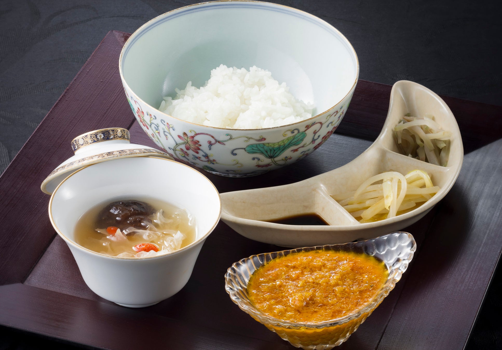 上海蟹のほぐし身と味噌を贅沢に使い、紹興酒で風味付けした餡をご自身でご飯にかけてお楽しみいただくスタイルです。付け合わせや、黒酢の名産地「鎮江」でつくられる香酢などをお召し上がりの途中で加えることで、風味が変わり、様々なお味が楽しめます。