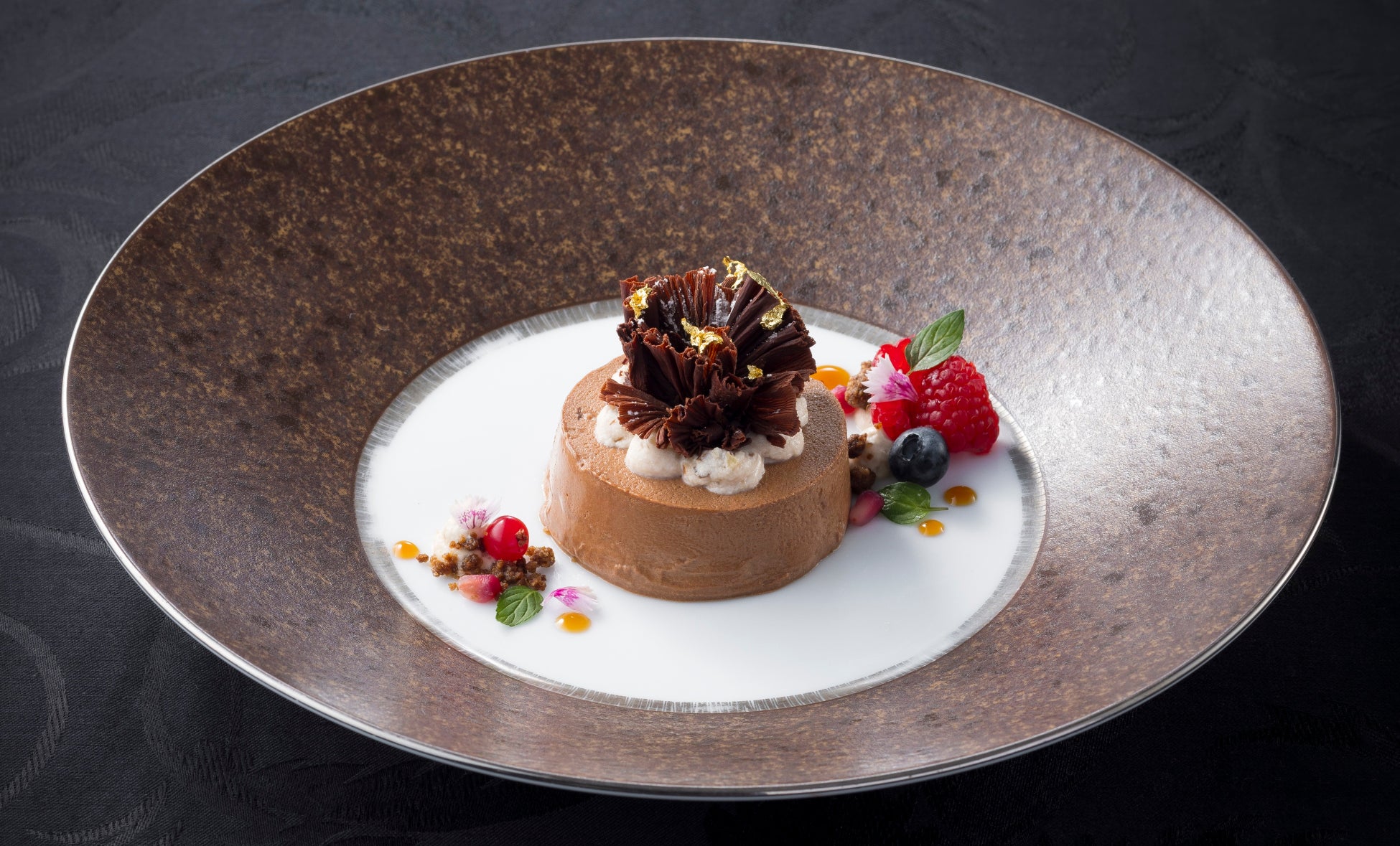 ココアのスポンジに、紹興酒の香りが溶け込んだ濃厚なカカオのムース、そしてシナモンとくるみのクリームとチョコをトッピングした華やかな大人のデザートです。フルーツやキャラメルソースを添え、お味の変化も楽しめます。