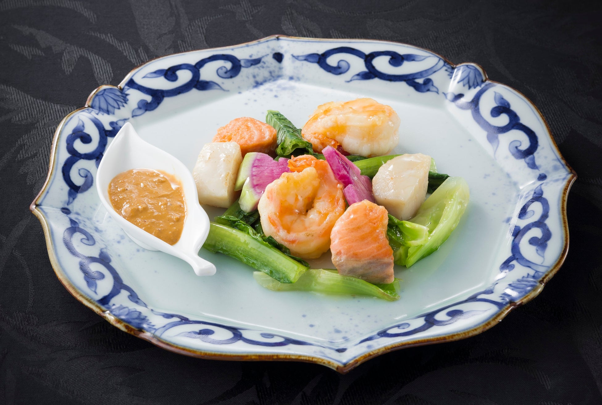 海老、帆立、サーモン、季節の中国野菜をシンプルに炒めました。濃厚な旨味を持つ鮟鱇の肝を蒸し、白味噌とXO醤を加えたオリジナルソースが、海の幸の新鮮な味わいを引き出します。