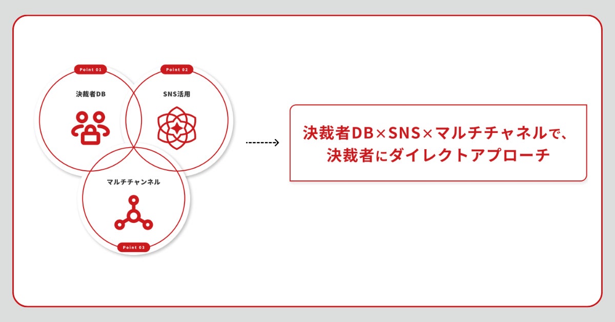 大手からベンチャー、中小企業まで約100件(国内最大級)の決裁者データベースを元に、貴社のターゲットとなる企業の決裁者へSNS(LinkedIn等)からダイレクトアプローチを実行します。また、弊社が保有している決裁者情報に基づいた多角的(マルチチャネル)アプローチにより営業効率化の最大化やABM(アカウントベースドマーケティング)を実現。
