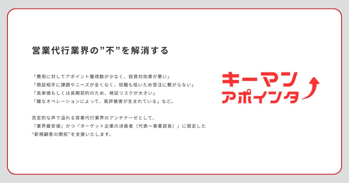 キーマンアポインターは、「担当者への接触が難しく、アポ率が低い」「ニーズや決裁権の無い方とのアポイントが多く、受注率が低い」など否定的な声で溢れる営業代行業界の中、 『ターゲット企業の決裁者(代表〜事業部長)』に限定した “新規顧客の開拓”を支援する新時代のリード獲得サービスです。