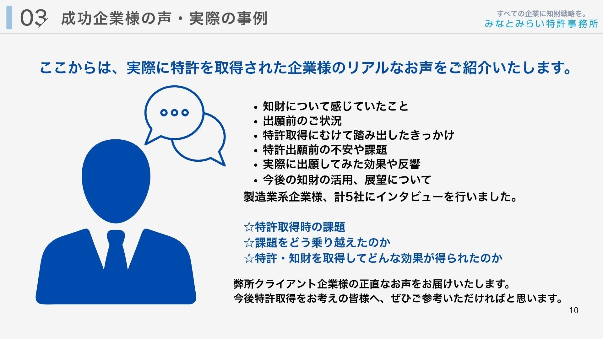 本ホワイトペーパーの最大の特徴は、実際に特許を取得した企業の「リアルな体験談」をインタビュー形式で掲載している点です。