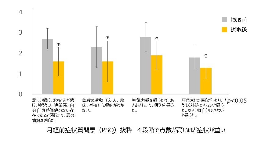 結果、「ゆううつ・落ち込んだ感じ」「興味がわかない」「無気力感」「圧倒された感じ」といった主に精神的な症状(心身の不調)の項目で大きくスコアが改善されていることが明らかとなりました。Pediococcus属の乳酸菌を直接飲用することでPMSによる心身の不調を改善するという臨床試験結果は世界でも希少な報告例となります*1。