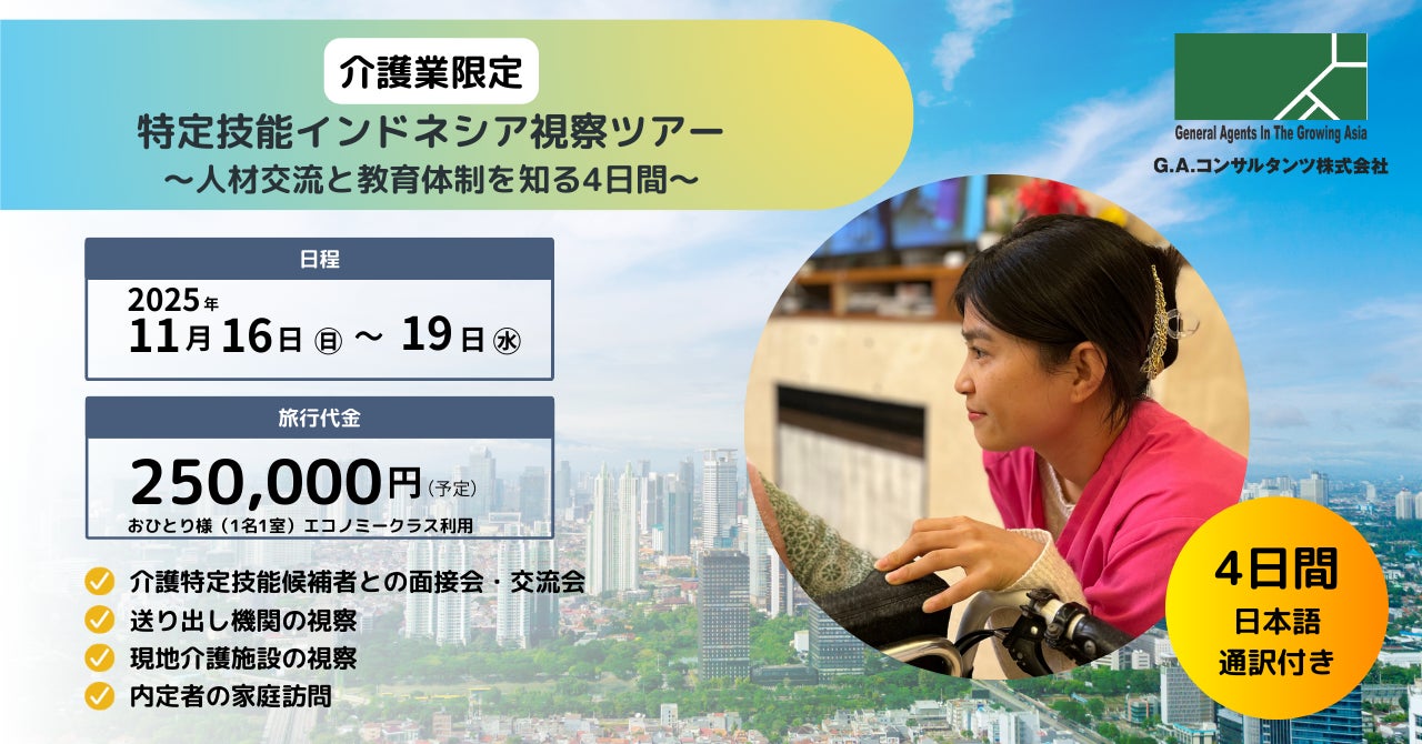 G.A.コンサルタンツ株式会社(本社:東京都渋谷区、代表取締役:勝本 健司)は、2025年9月24日より、「介護業限定|特定技能インドネシア面接・視察ツアー」の申込受付を開始しました。本ツアーでは、インドネシア・ジャカルタの現地教育機関や介護実習施設を訪問し、候補者との面接や日本語授業の見学を通じて、外国人採用の具体的なイメージを掴むことができます。
